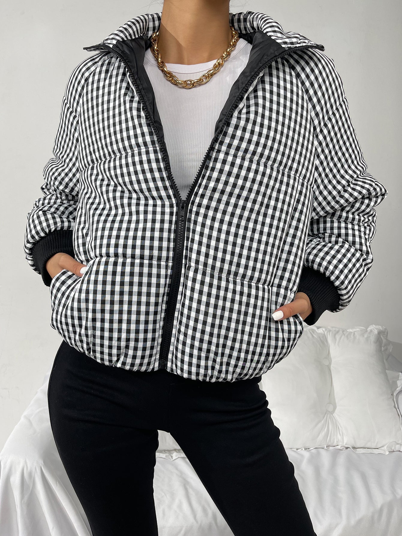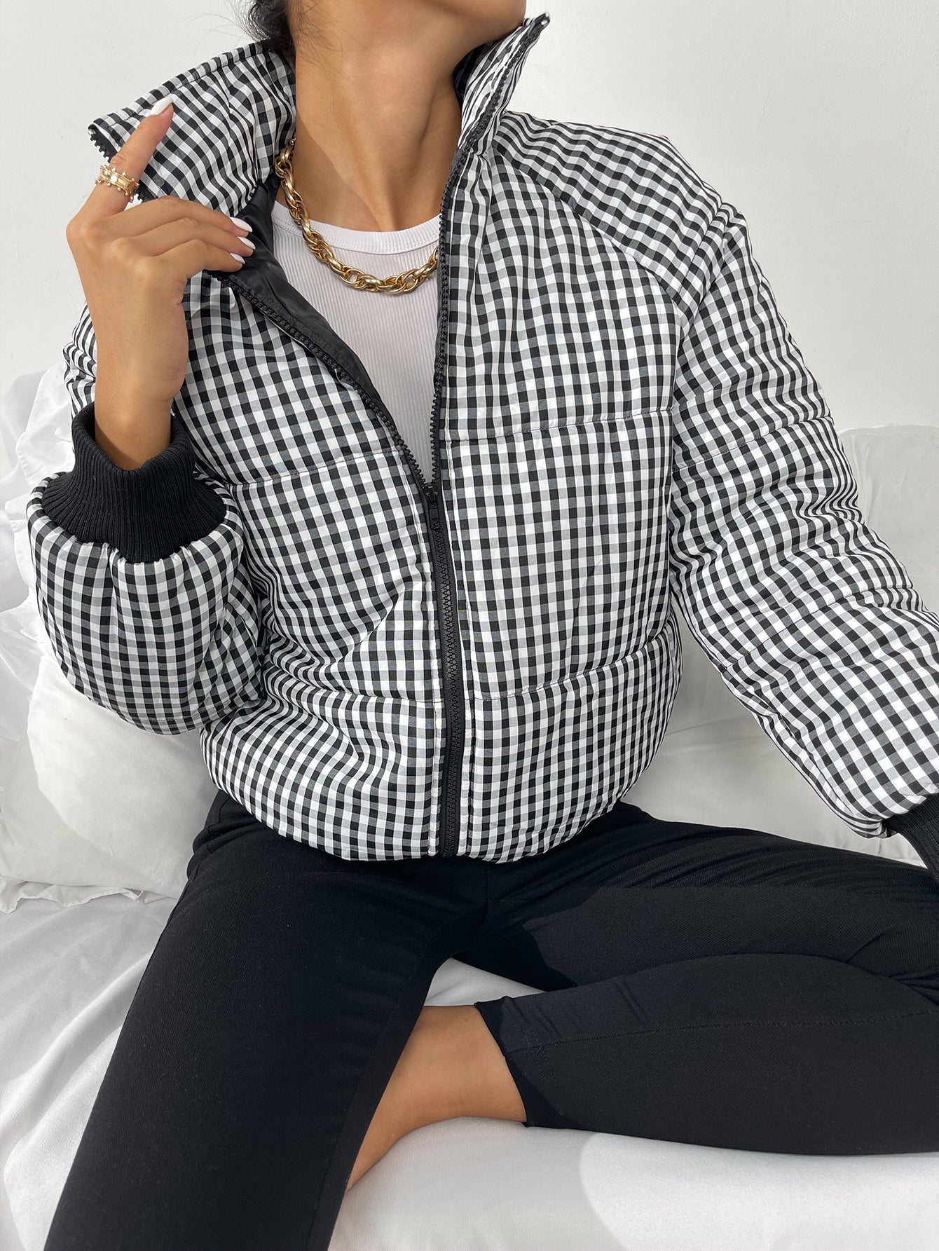 High Neck Gingham Print Zip Up Winter Coat Sai Feel