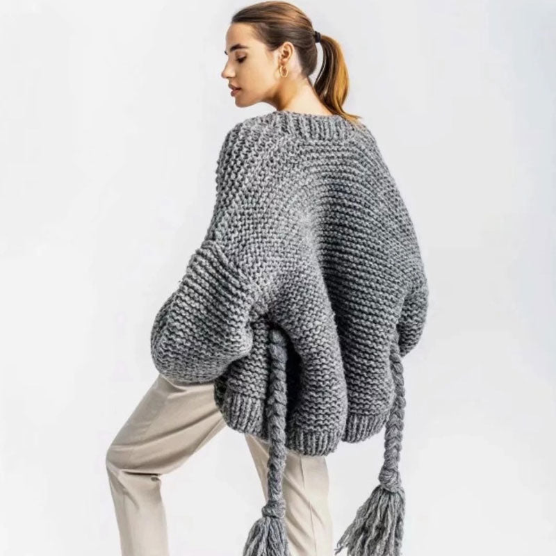 Mit ihrer entspannten, offenen Silhouette in klassischer Unifarbe verleiht diese luxuriöse, vielseitige Strickjacke mit Laternenärmeln Ihrer Pullovergarderobe einen gemütlichen und zugleich schicken Touch. Sie ist aus hochwertigem, dehnbarem Baumwollmischgewebe gefertigt. Diese glamouröse Strickjacke hat übergroße, lange Bischofsärmel mit engen Bündchen und überschnittene Schultern. Geflochtene Gürtel mit Fransensaum an den Seiten runden das Design ab. Kombinieren Sie sie mit schwarzen Hosen und spitzen Absätzen für einen lässigen, aber trendigen Look. Unsere Designerkollektion umfasst auch weitere trendige Strickjacken für Damen.
