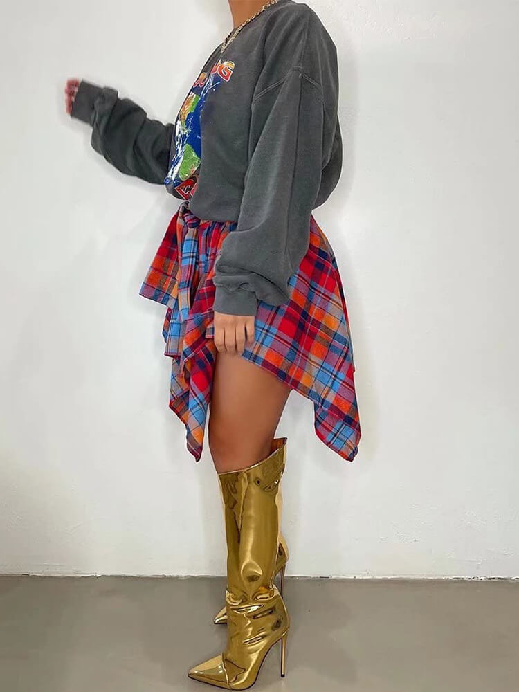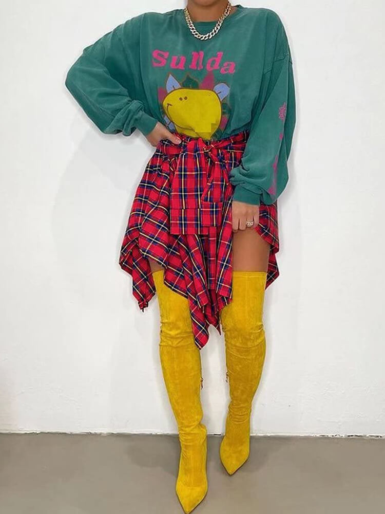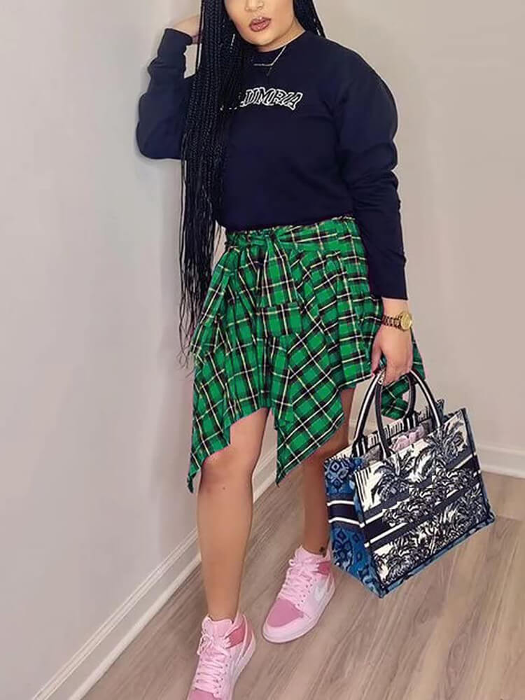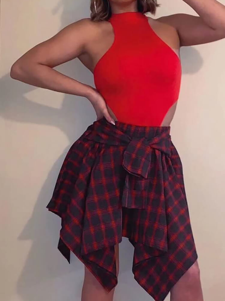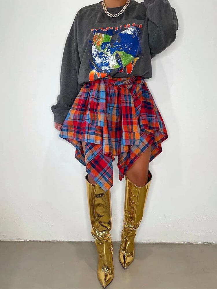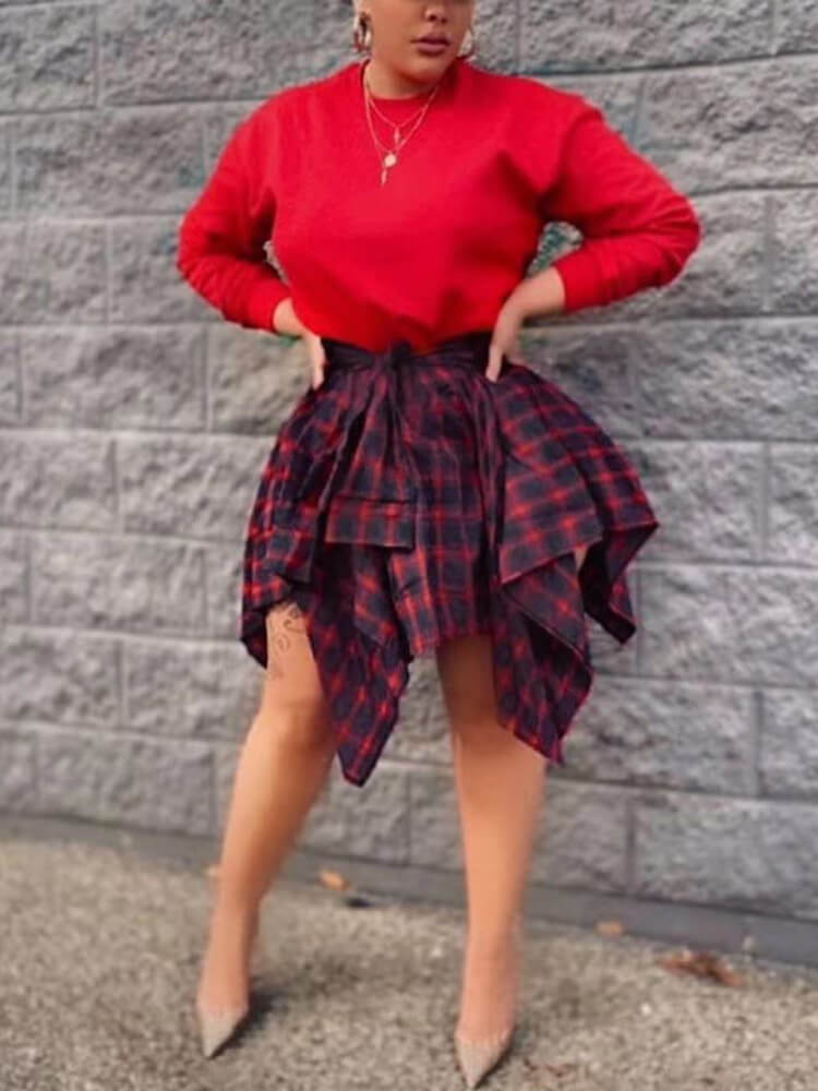 Merkmale: Hohe Taille. Kariert. Plissiert. Zum Binden. Asymmetrisch. Minirock.