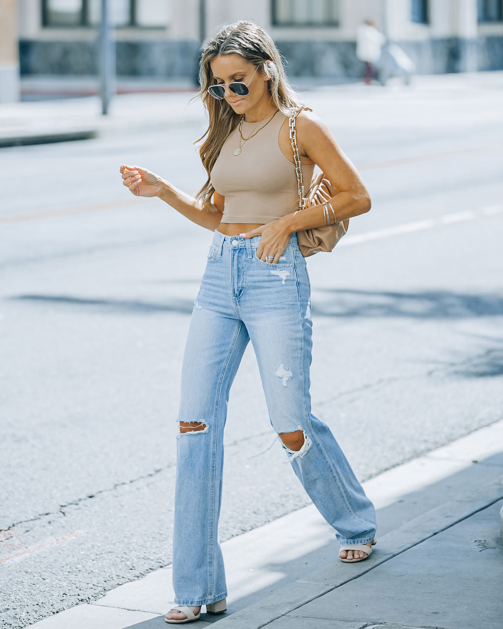 Absoluter Cool-Girl-Style im Davi High Rise Distressed 90's Flare Denim in heller Waschung ohne Stretch und mit ausgestelltem Bein.