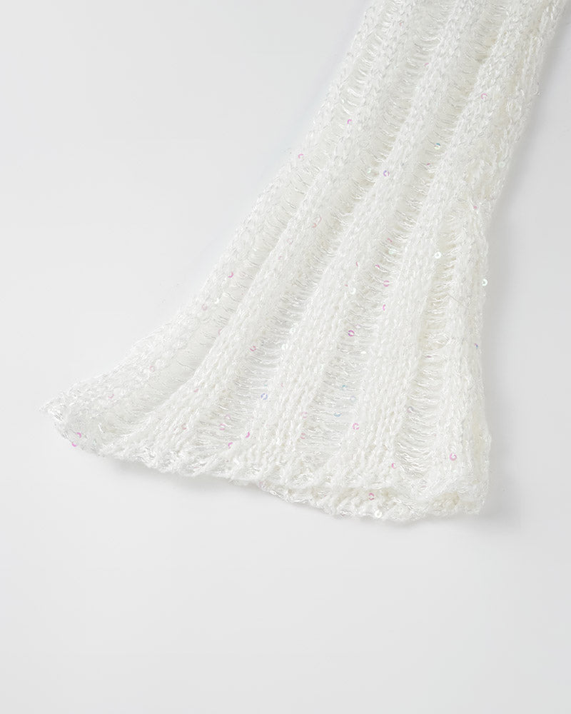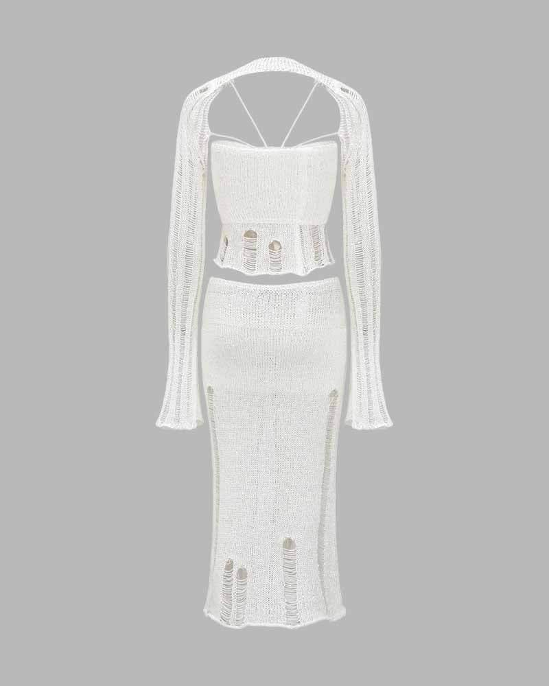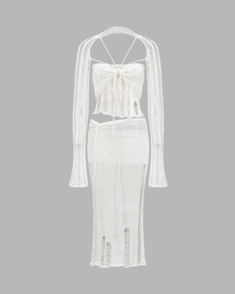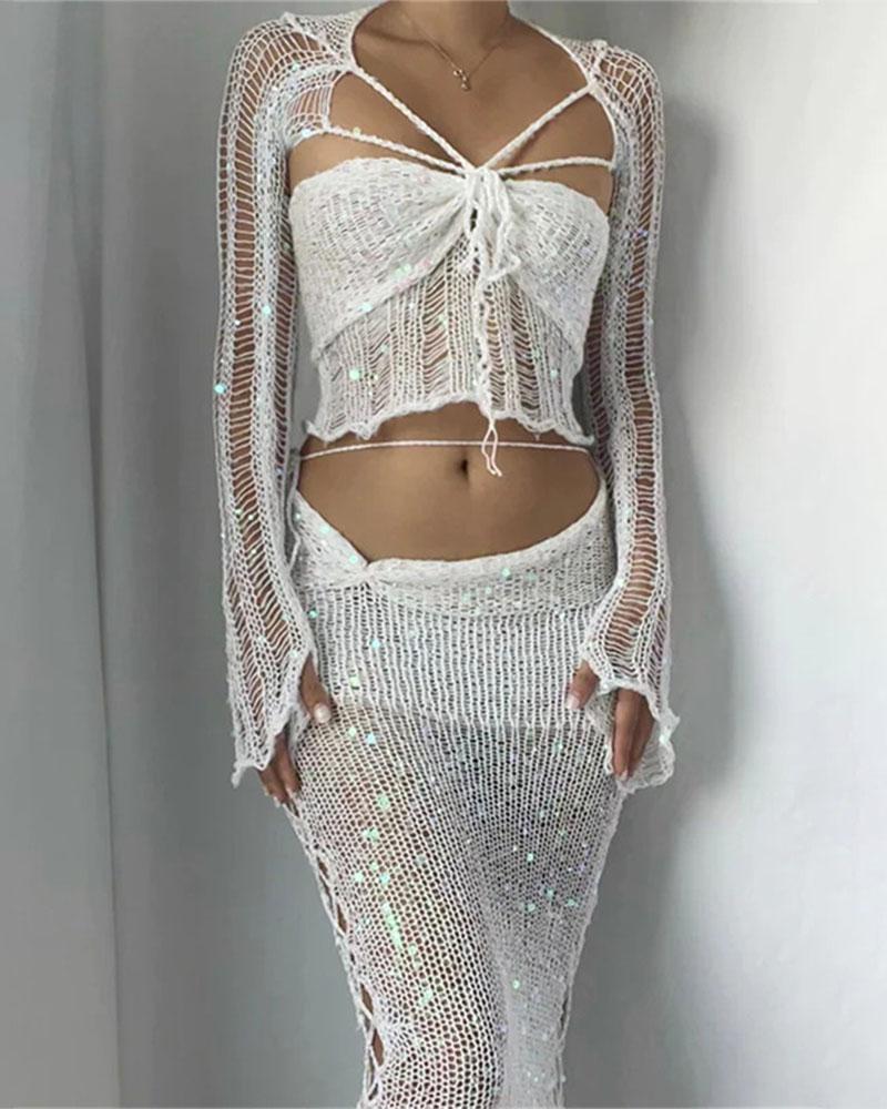 Details: Schimmerndes Häkel-Set. Mit Bralet-Teil, langen Ärmeln und langem Rock.
