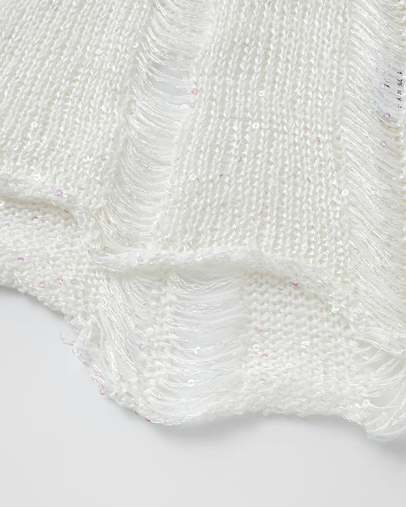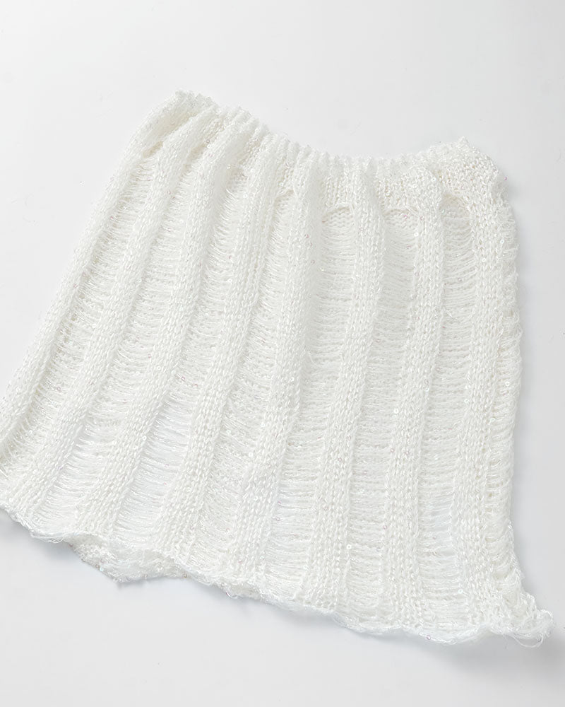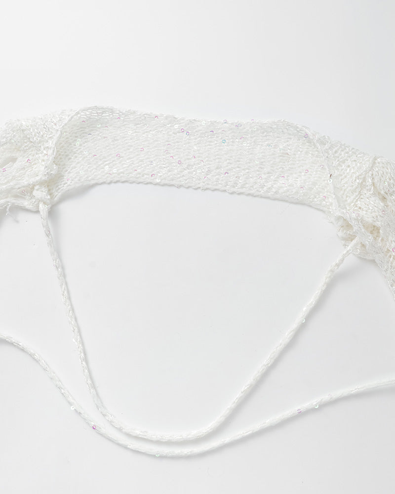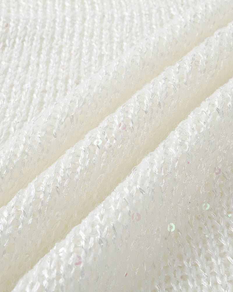 Details: Schimmerndes Häkel-Set. Mit Bralet-Teil, langen Ärmeln und langem Rock.