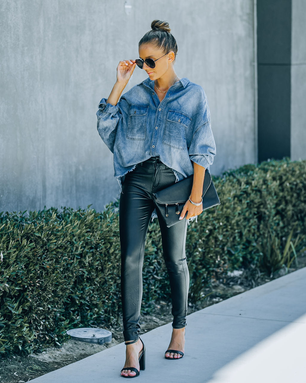 Jede Herbstgarderobe braucht eine Kunstlederhose! Unsere Estelle High Rise Faux Leather Skinny ist in Schwarz erhältlich. Die Hose hat einen Reißverschluss und einen Knopfverschluss vorne. Das Design besticht durch schmeichelnden Stretch-Touch. Kombiniert mit der Lenox Pilotenbrille mit schwarzem Rahmen und grauem Farbverlauf. Chloe Mini-Halskette. Schlichter Armreif. Stella Umhänge-Clutch mit Reißverschluss. Brody Baumwoll-Jeanshemd mit Taschen und ausgefranstem Saum. Whimsy Heel.