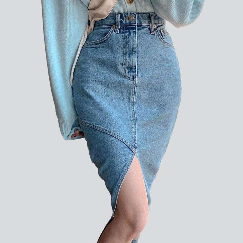 Bringen Sie Ihren 90er-Jahre-Chic mit unserer Frühjahr-Sommer-Kollektion 2023 mit hoch taillierten Damen-Jeansröcken mit Frontschlitz zum Vorschein! Hergestellt aus hochwertigem, hell gewaschenem Denim. Dieses Grunge-Meisterwerk ist die perfekte Mischung aus zeitgenössischem Trend und nostalgischer Nostalgie.