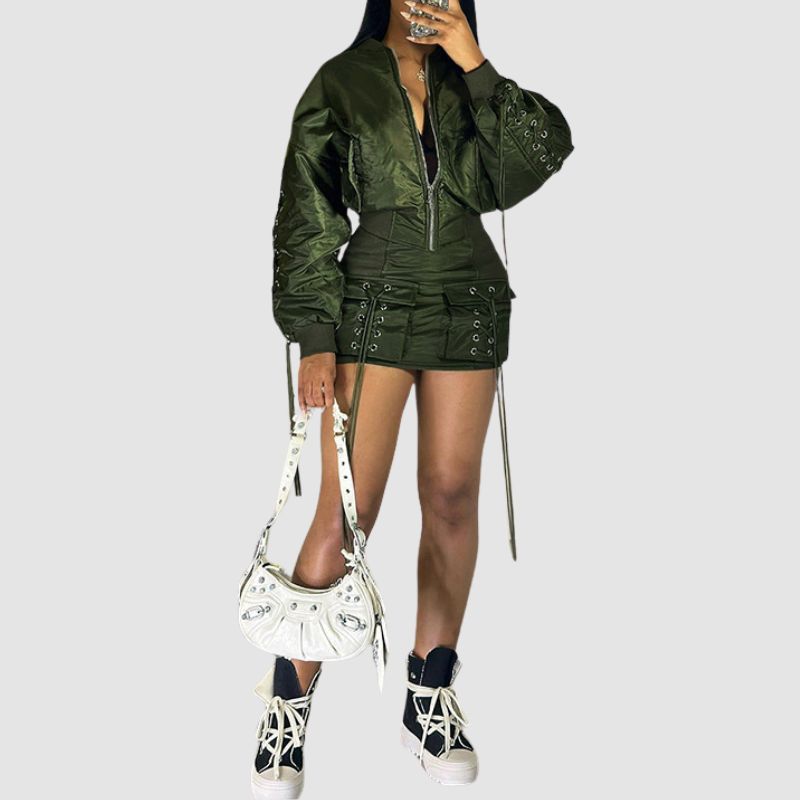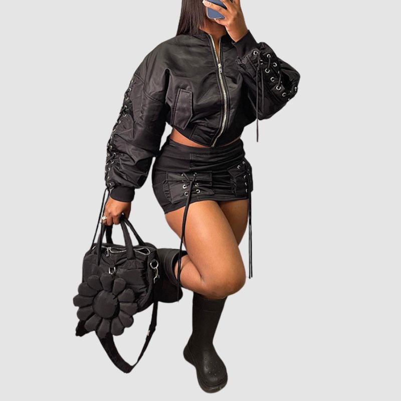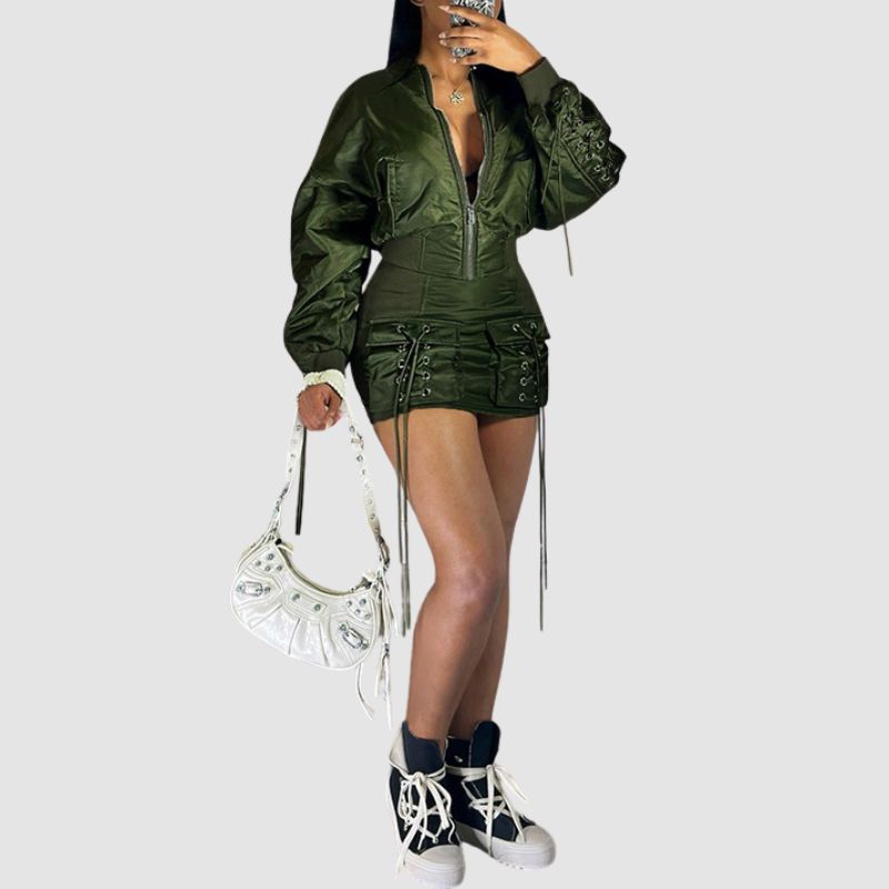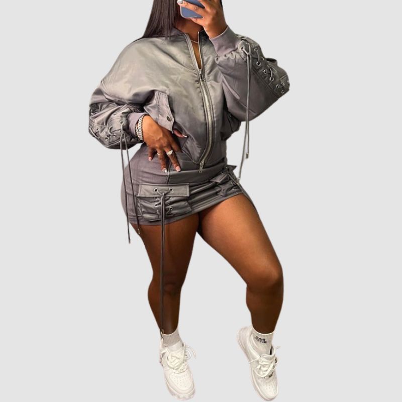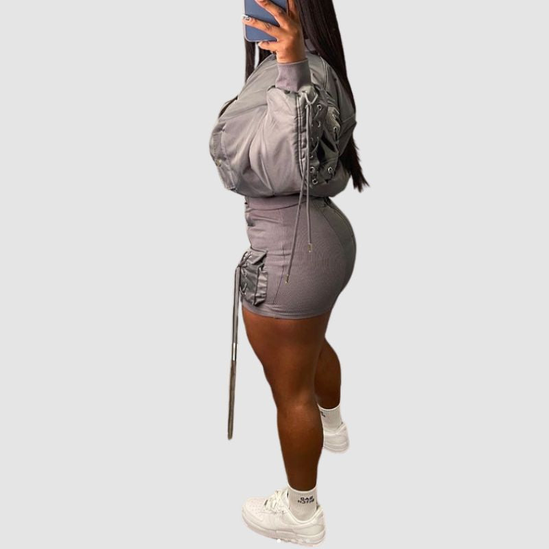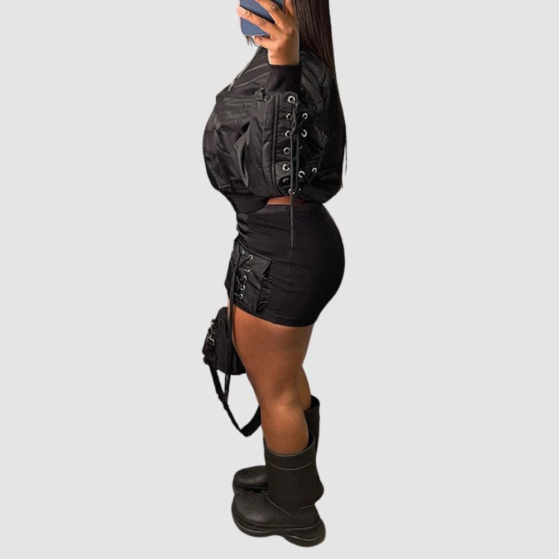 Eigenschaften: Set. Rock. Jacke. Langarm. Rundhalsausschnitt. Reißverschluss. Figurbetont. Einfarbig. Schwer. Riemchen. Hohe Taille. Minirock.