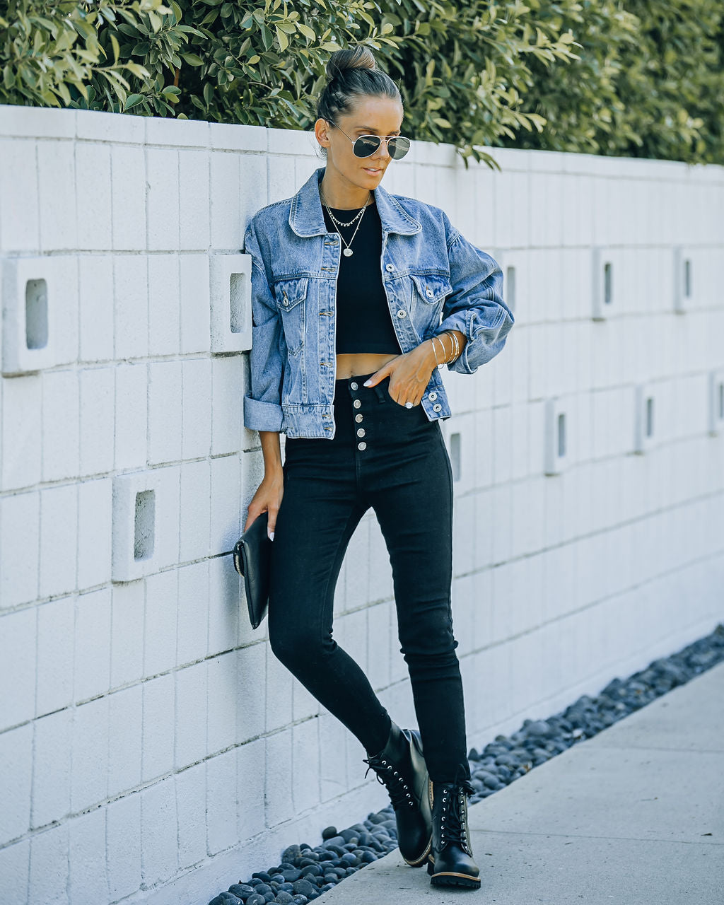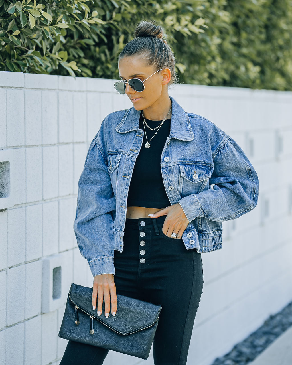 Unsere High Road Cropped Jeansjacke ist ein bewährter Klassiker! Diese mittelblaue, kurze Jacke hat Ziertaschen auf der Brust. Sie ist mit Knopfverschluss vorne und Knopflaschen an der Taille versehen. Kombiniert mit der Chloe Mini-Kette, der Compass Coin-Kette, der Stella Crossbody-Clutch mit Reißverschluss, dem Kiki Strick-Crop-Top, der Big Easy High Rise Black Skinny und den Brycen Kunstleder-Schnürstiefeln.