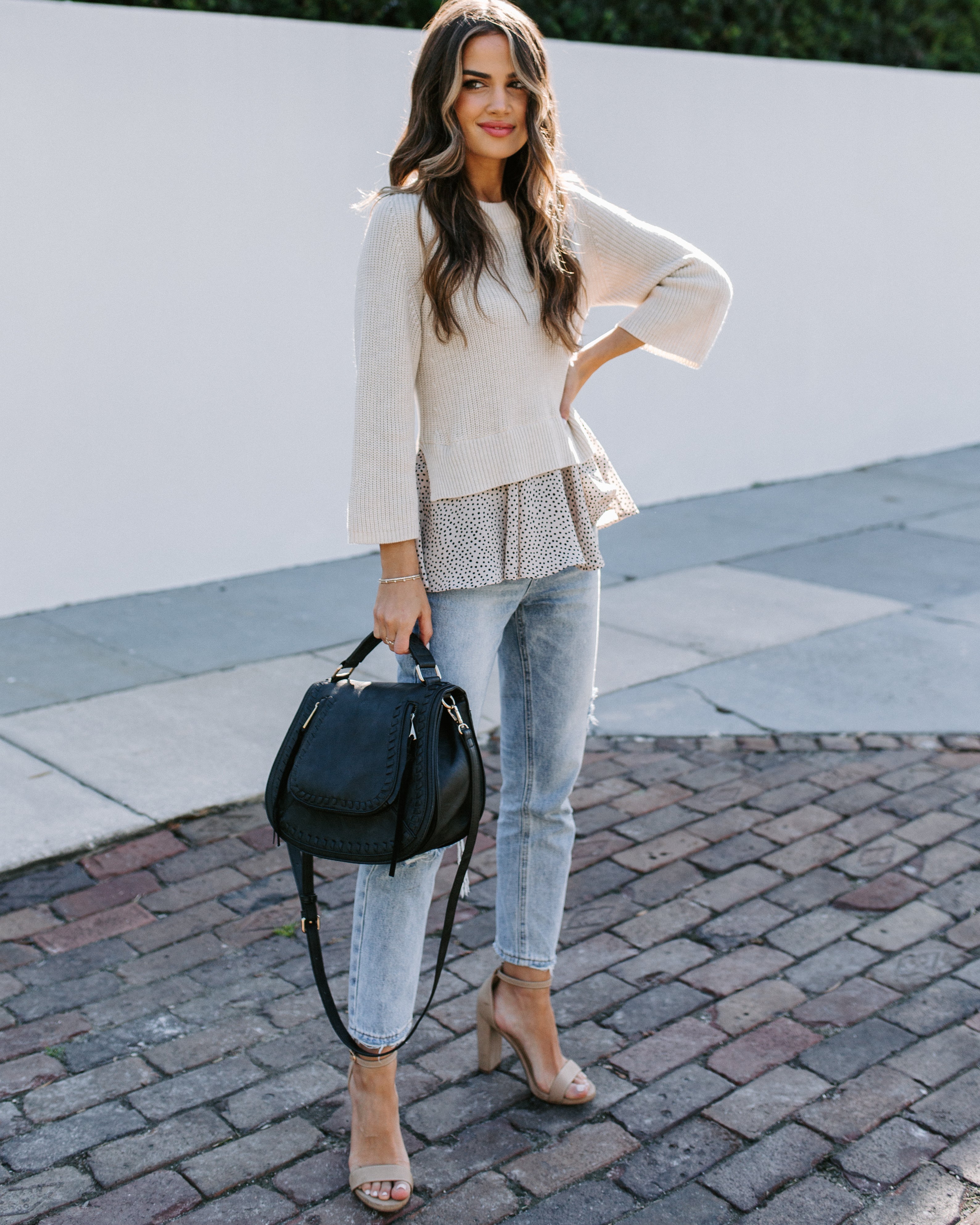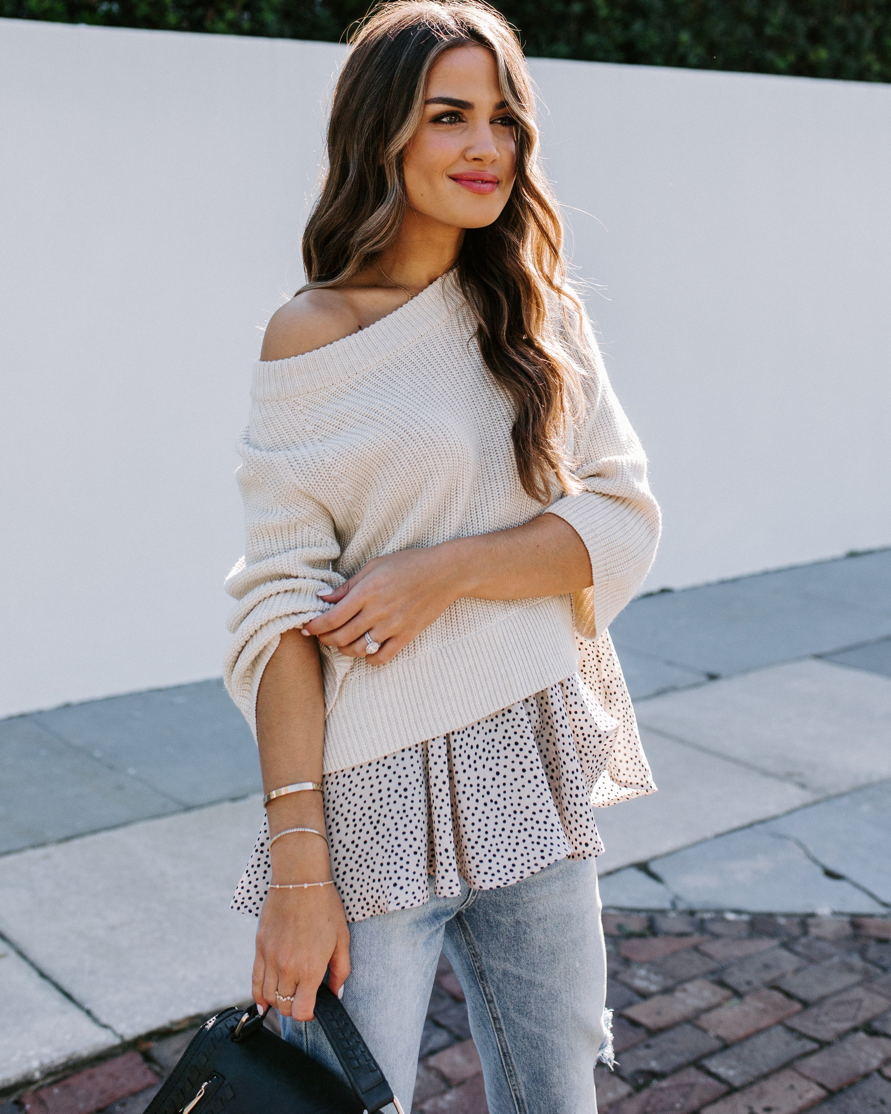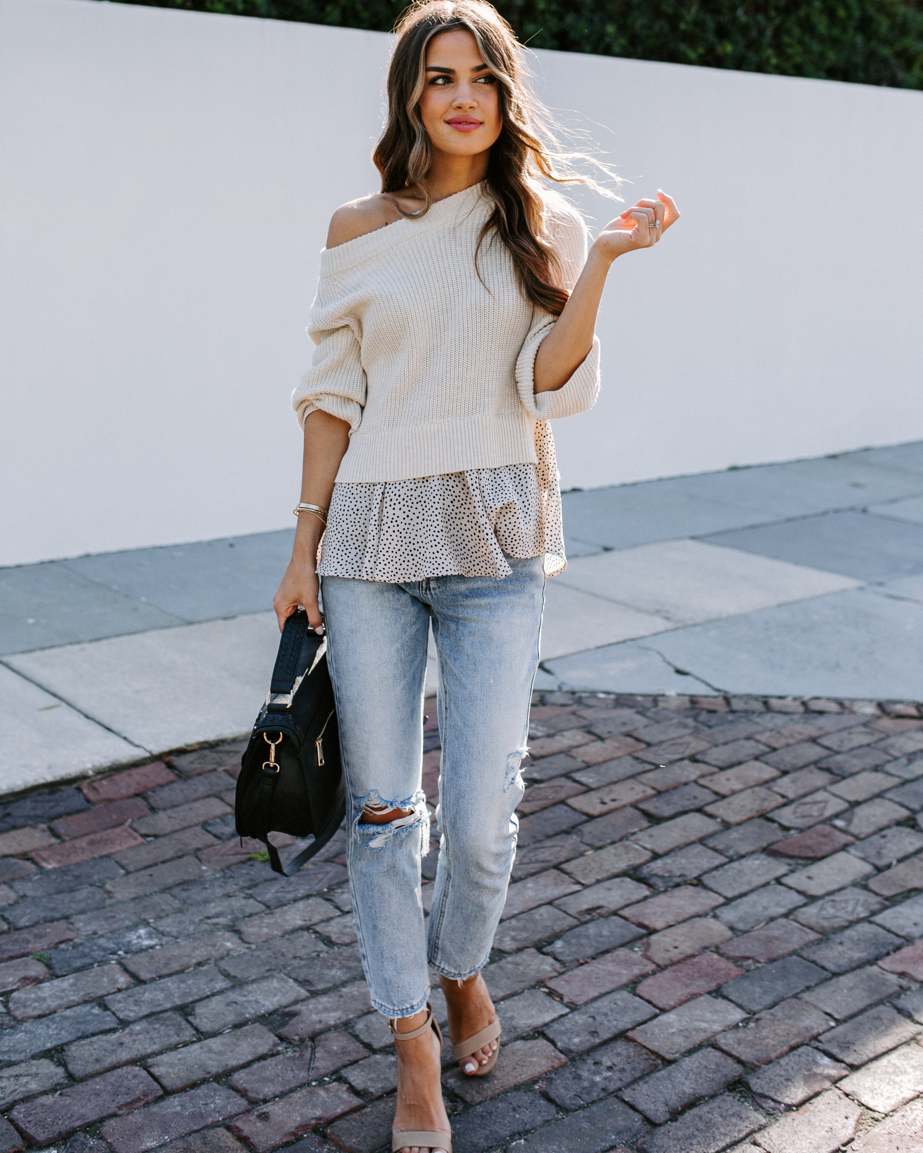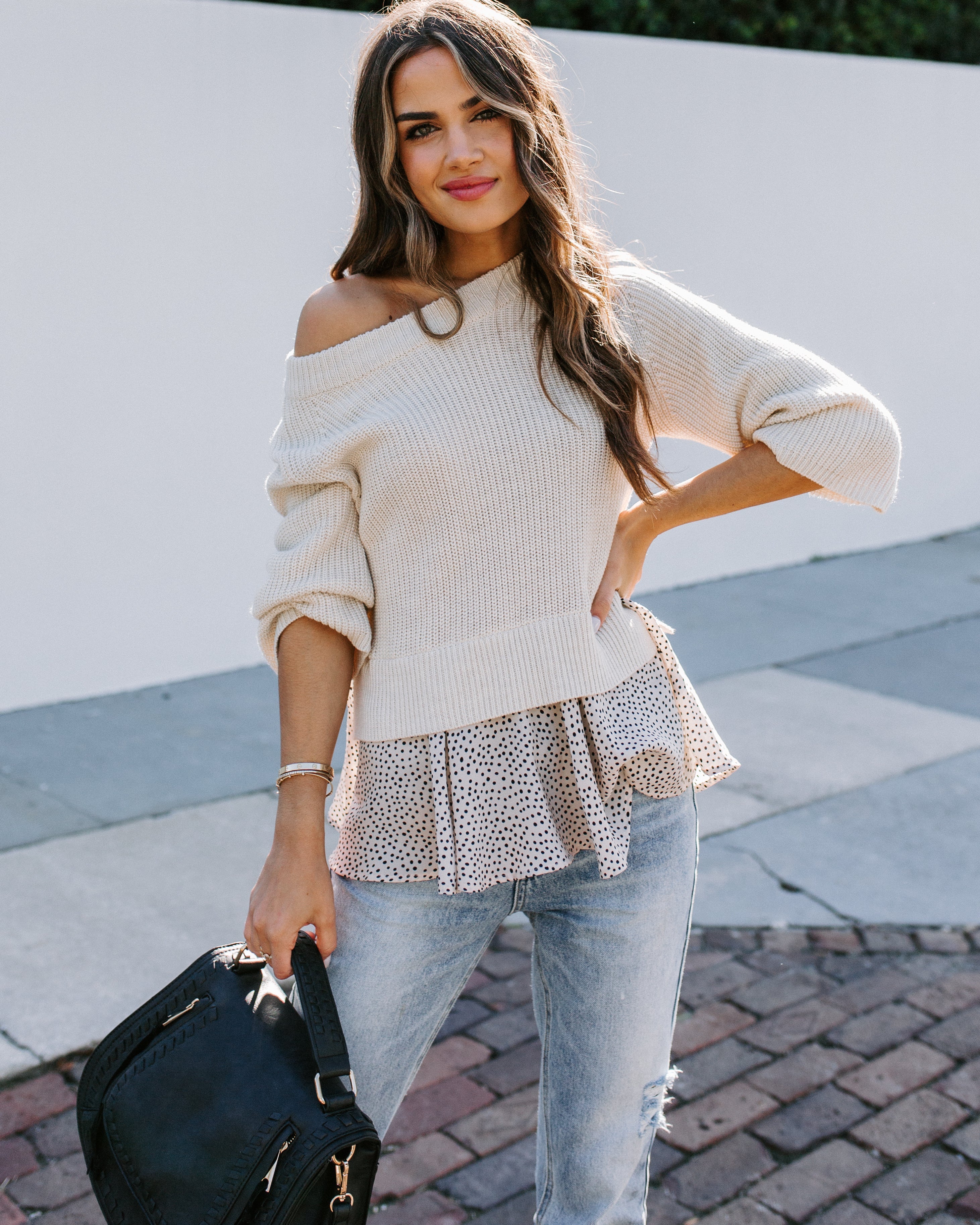 Der Humble Abode Kontrast-Strickpullover bietet zwei Looks in einem! Ein creme-schwarz gepunkteter Saum schwebt unter dem cremefarbenen Strickpullover und verlängert ihn mit einem hemdähnlichen Illusions-C, ohne die Falten eines maßgeschneiderten Hemdes! Passform mit Rundhalsausschnitt, langen Ärmeln und durchgehender Rippung. Stylen Sie diesen Preppy-Chic-Look für Arbeit und Freizeit! Kombiniert mit der Kason Distressed High Rise Denim, Royale Heels und der Highland Bag.