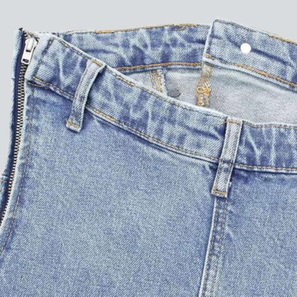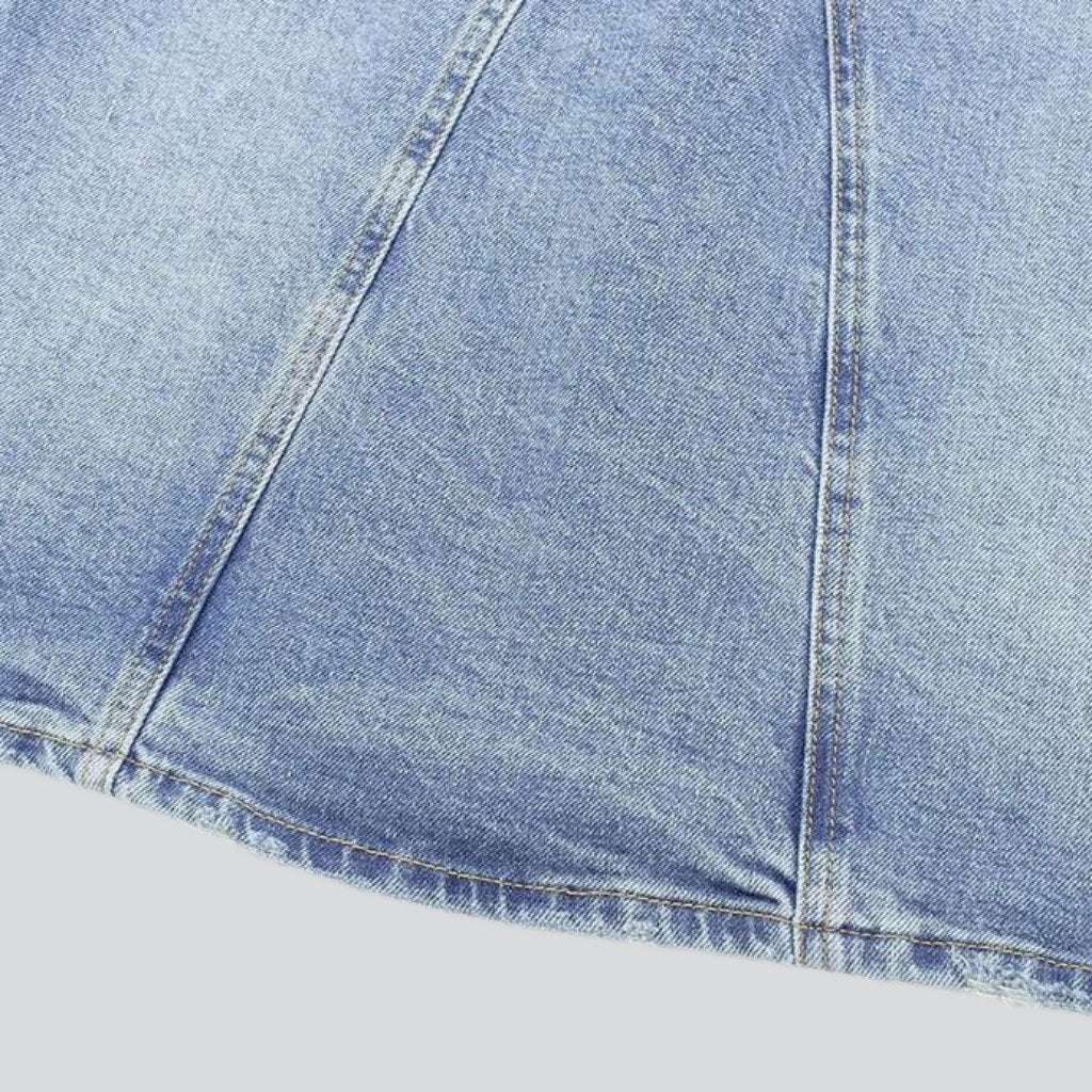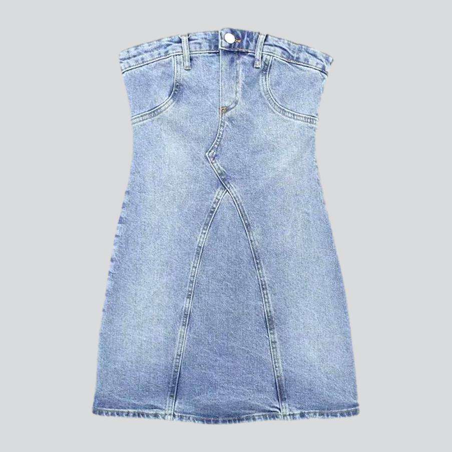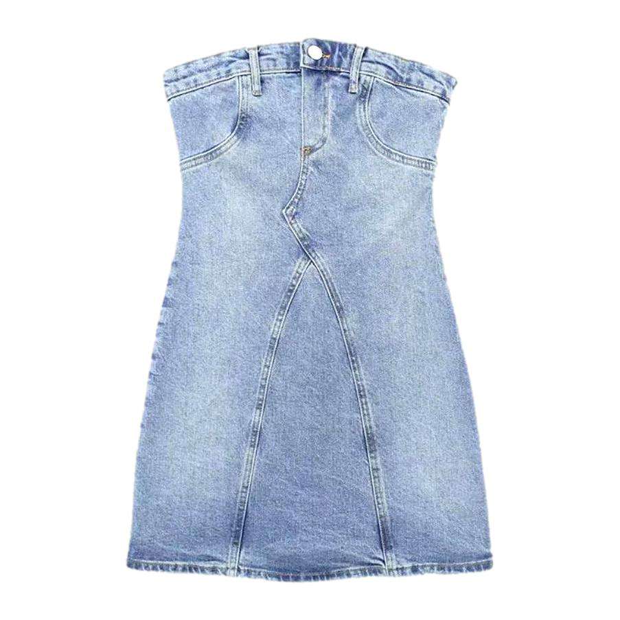 Dieses modische Kleid zelebriert Retro-Stil und moderne Trends. Der hell gewaschene Denim-Stoff besticht durch seinen klassischen Charme und verleiht jedem Look Raffinesse. Mit dem schulterfreien Design, dem Reißverschluss und den stilvollen Knopfdetails sehen Sie überall schick aus und fühlen sich entspannt.