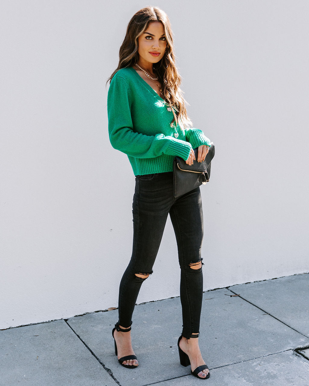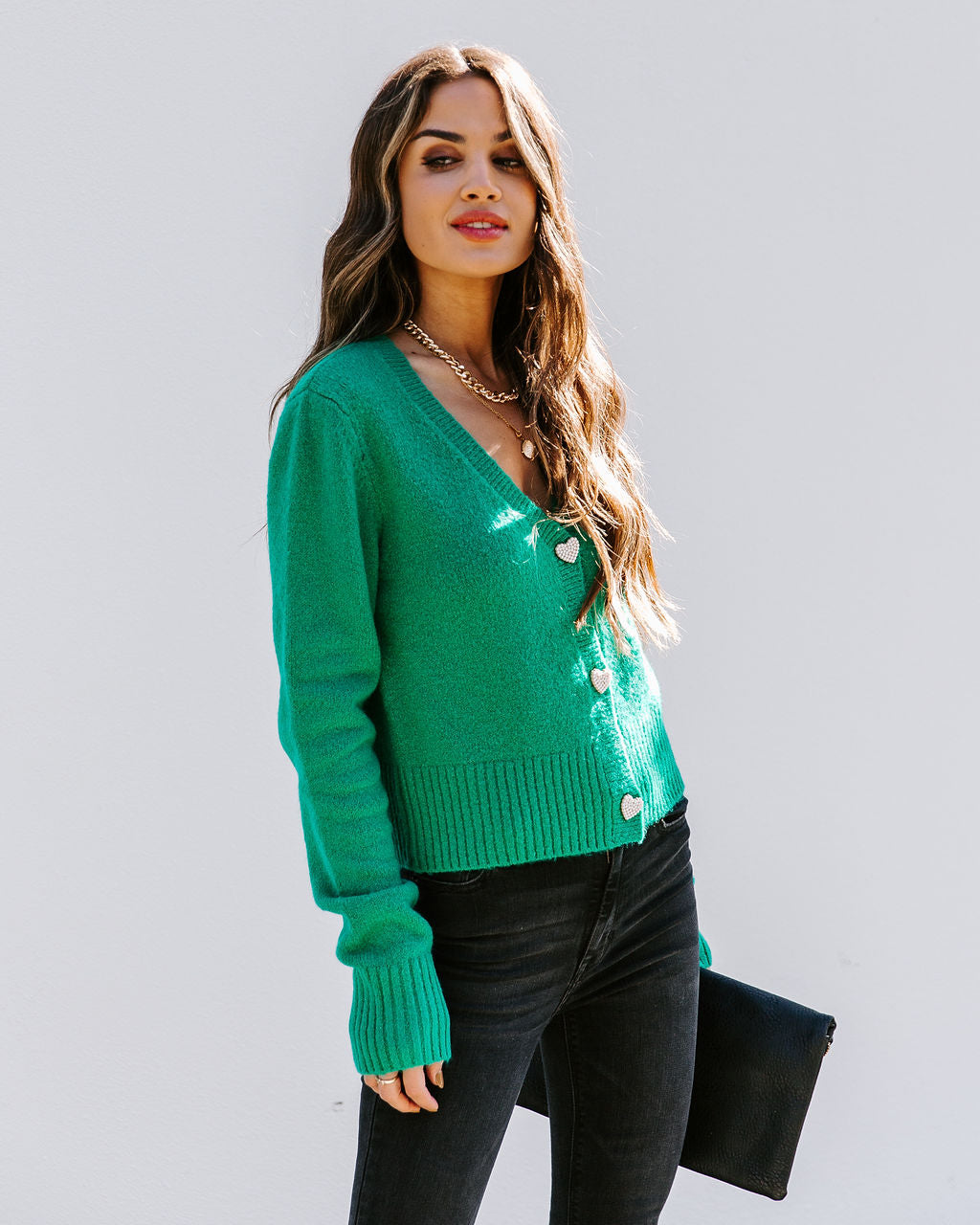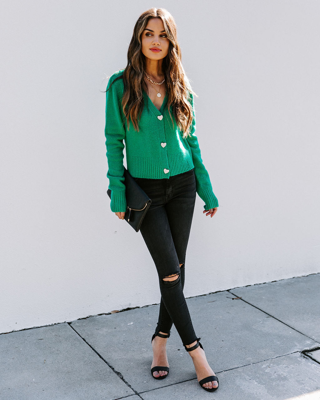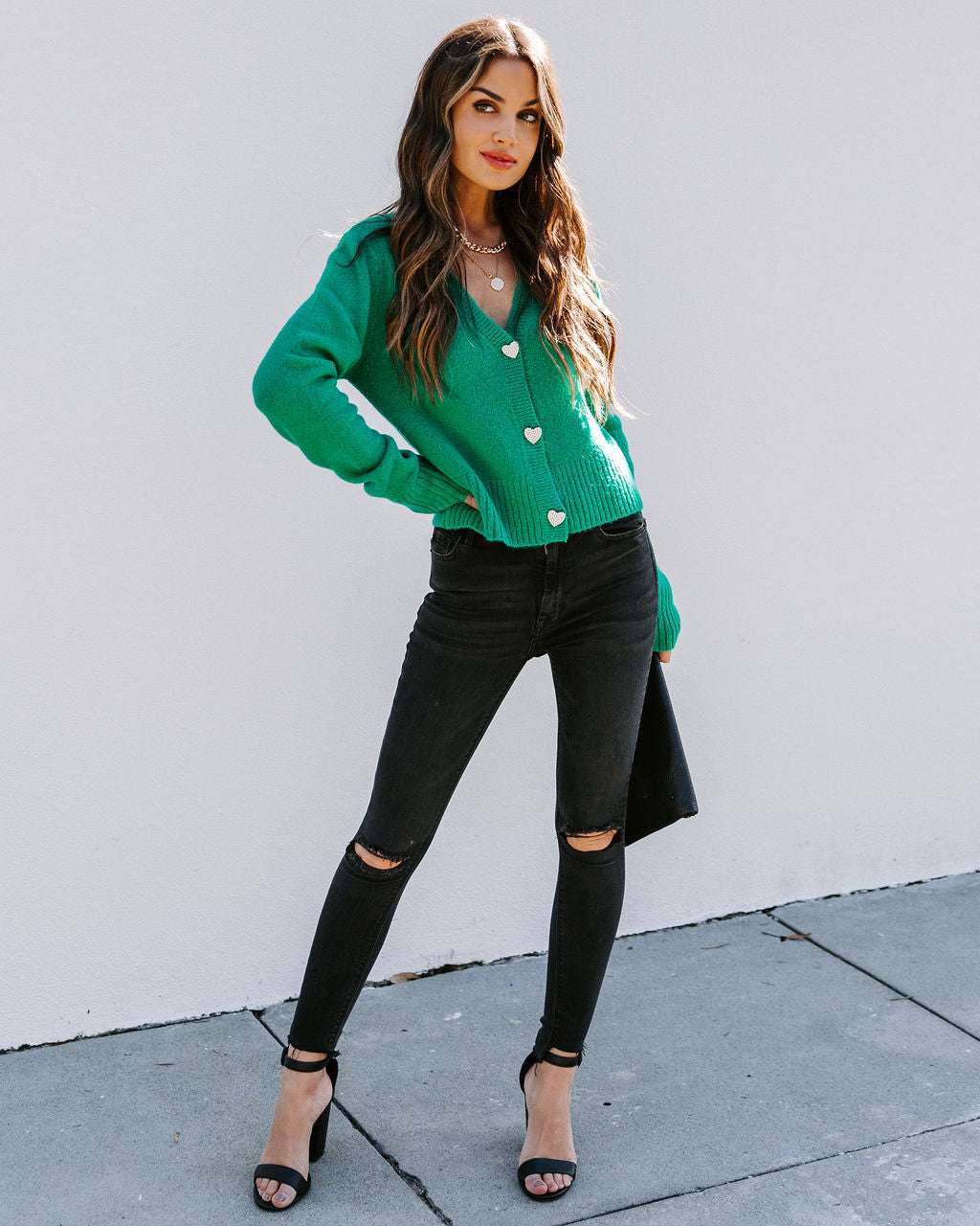 Die Perlenverzierung macht diesen Cardigan so ikonisch! Unser Lovey Button Front Knit Cardigan ist in grünem Strick mit V-Ausschnitt und herzförmigen Perlenknöpfen erhältlich. Dieses Teil ist ein Must-have für den Winter! Kombiniert mit der Ritual-Anhängerkette, der Mica-Ketten-Halskette, dem Cling Twisted Armreif, der Stella Crossbody Envelope Zip Clutch, der Volt High Rise Distressed Skinny und dem Whimsy Heel.