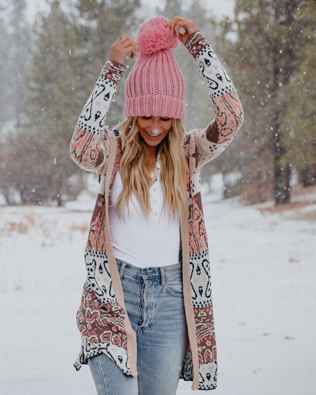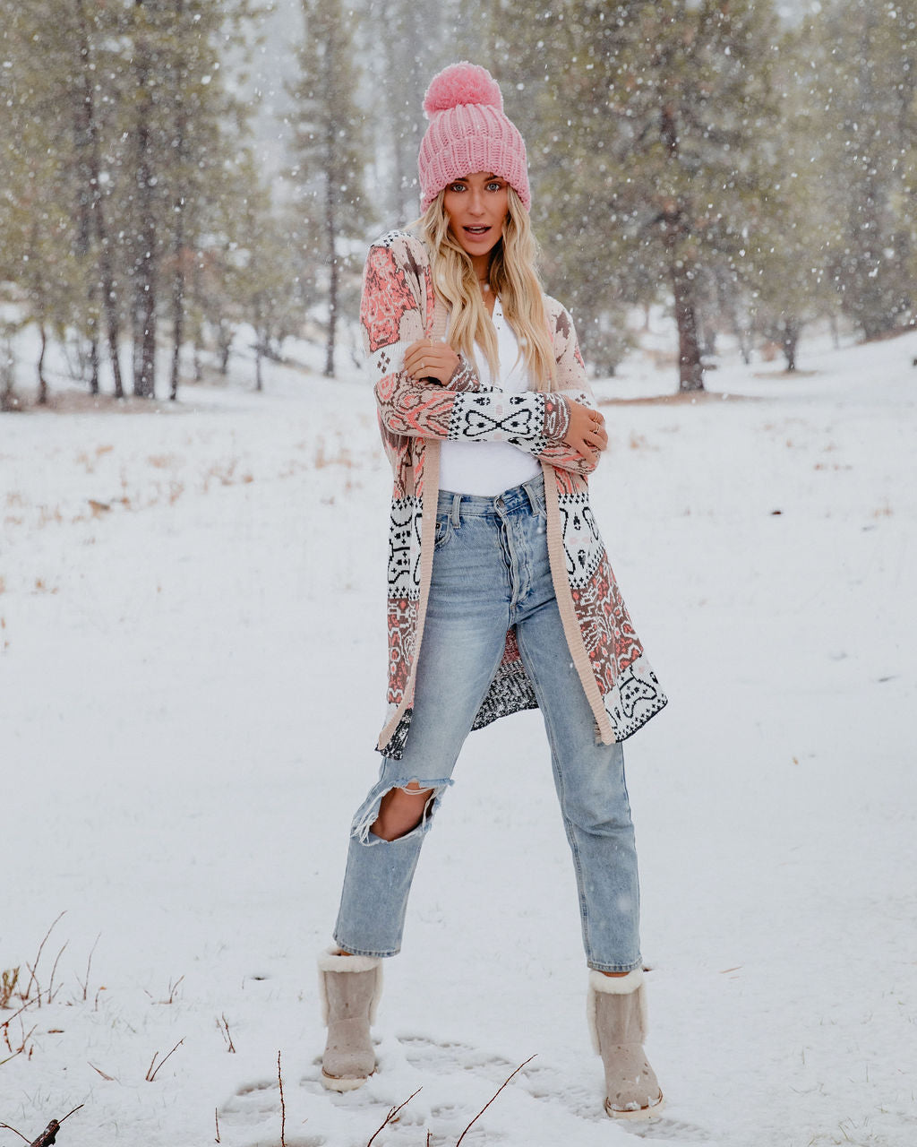 Unser „Magic Of The Season“-Strickcardigan mit Kapuze ist so vielseitig! Taupe, Mokka, Pink, Weiß und Cremetöne prägen diesen Cardigan. Mit offener Vorderseite und Seitenschlitzen. Ohne Verschlüsse. Kombiniert mit der Whistler Pom Beanie. Perfekte Creolen. Chloe Mini-Halskette. Initialen-Kartenkette. Schlichter Armreif. Elise gerippter Henley-Body. Kason Distressed High Rise Denim. Und nordische Stiefel mit Kunstfellbesatz.