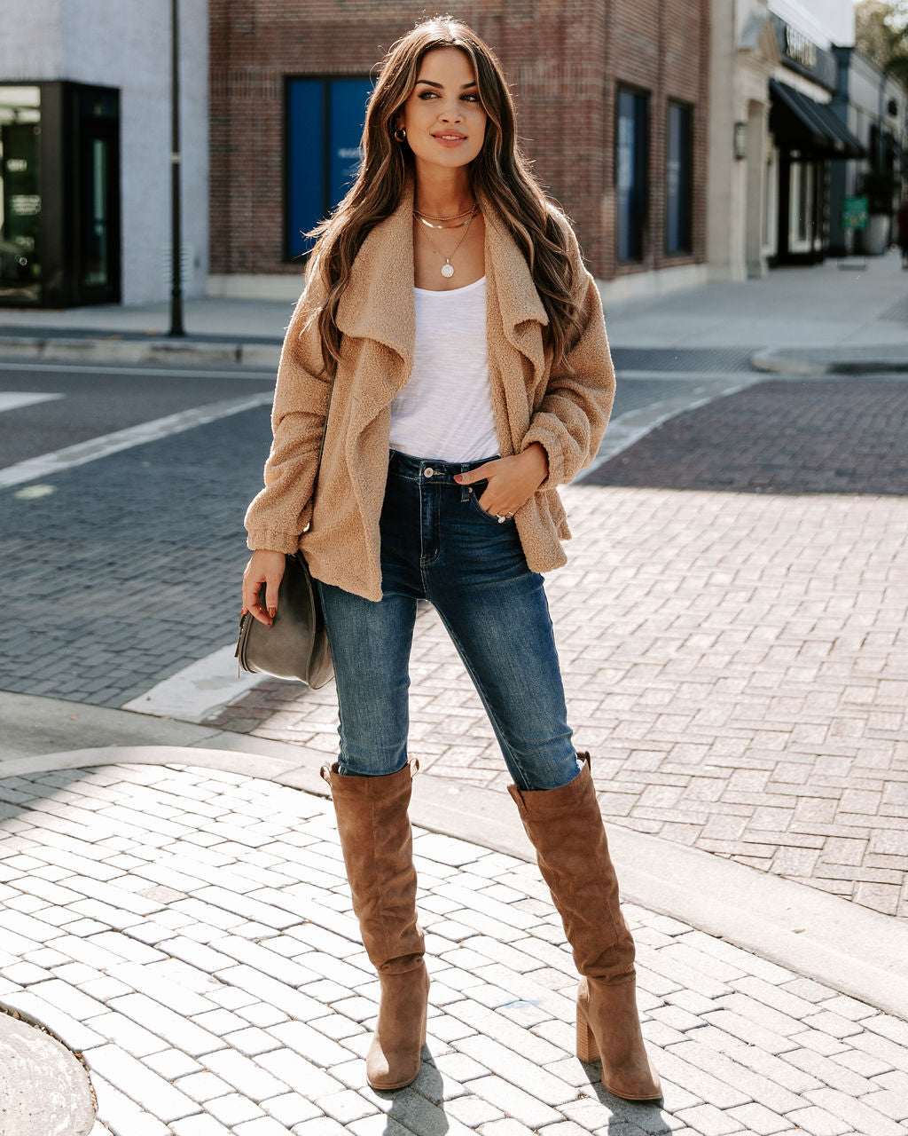 Verleihen Sie Ihrer Garderobe mit unserer Martha Pocketed Drape Sherpa Jacke einen Hauch von Klassik und Gemütlichkeit! Diese hellbraune Jacke hat einen drapierten Ausschnitt und lange Ärmel. Sie ist mit Seitentaschen und Knopfverschluss vorne ausgestattet. Kombiniert mit den Mercury Hoops. Minimalistische Fischgrätenkette. Emperor Coin Halskette. Schlichter Armreif. Highland Bag. Physique Racerback Tanktop. Jenna High Rise Skinny. und Saint Slouch Boot.