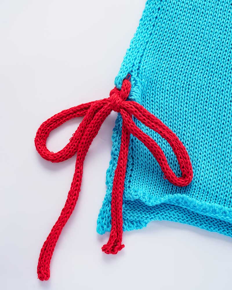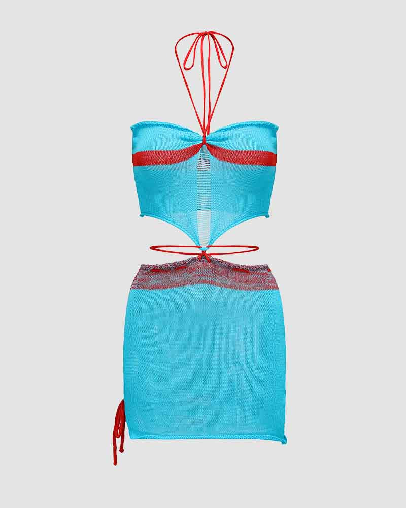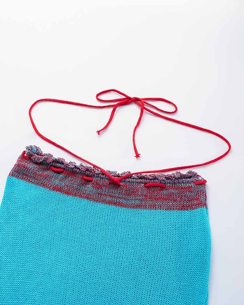 Details : Gehäkeltes Kombiset. Mit Neckholder-Oberteil und kurzem Rock.