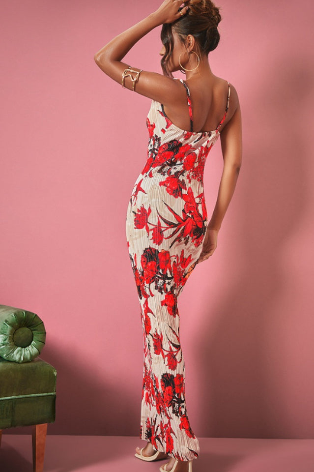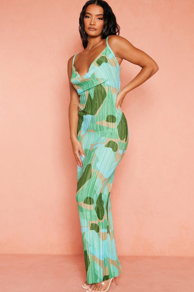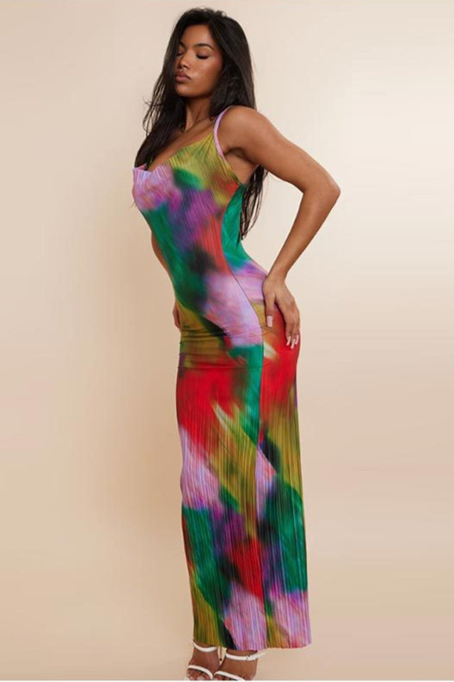 Dieses Maxikleid ist perfekt für jeden Anlass. Es besteht aus mehrfarbigem Plissee-Material mit dünnen Trägern und hat eine Maxilänge. Wie könnte man da nein sagen? Tragen Sie dazu helle Absätze und minimalistische Accessoires, um alle Blicke auf sich zu ziehen.