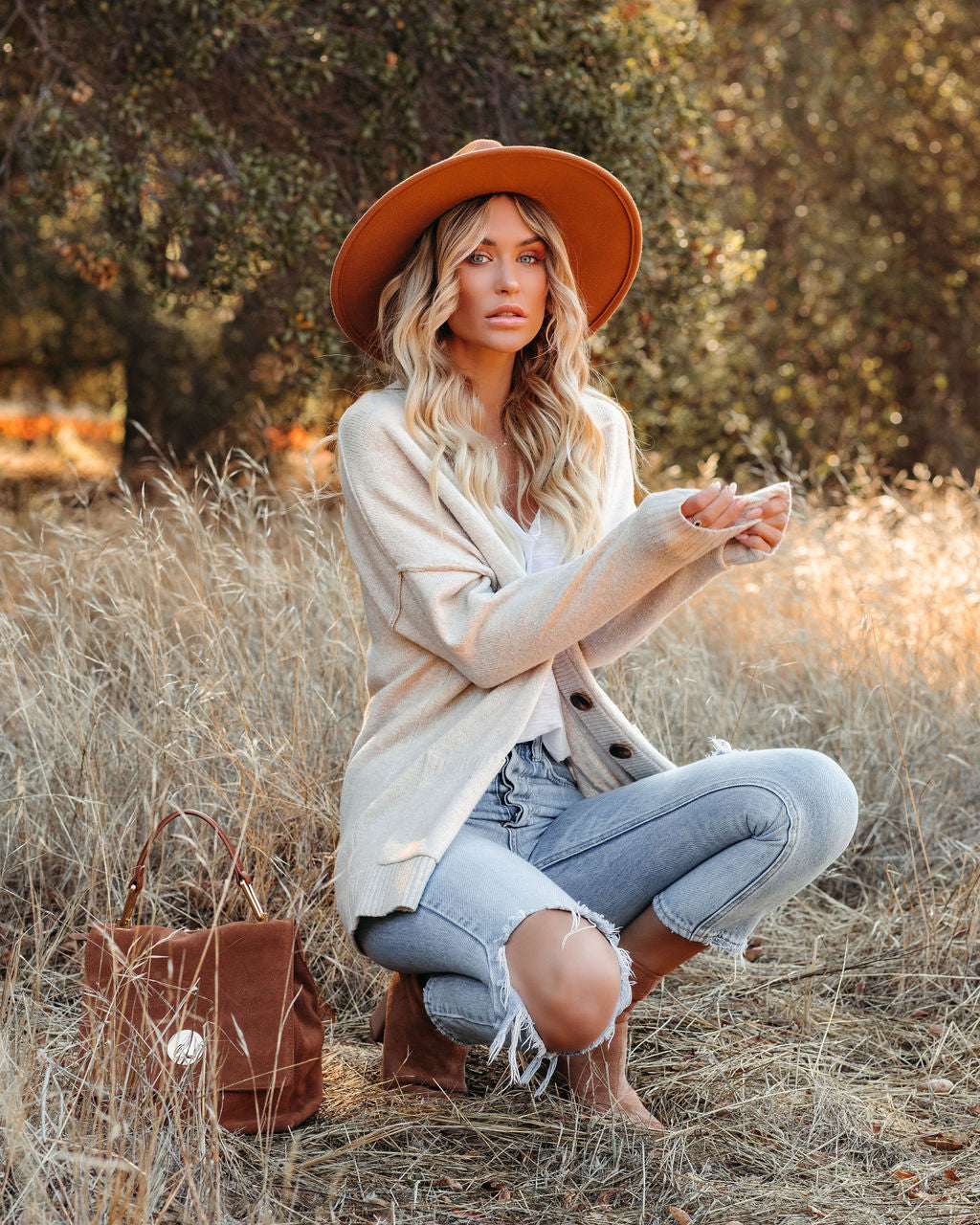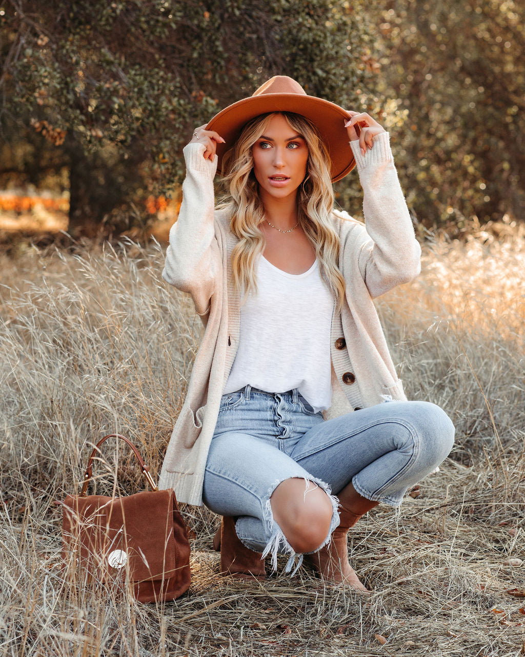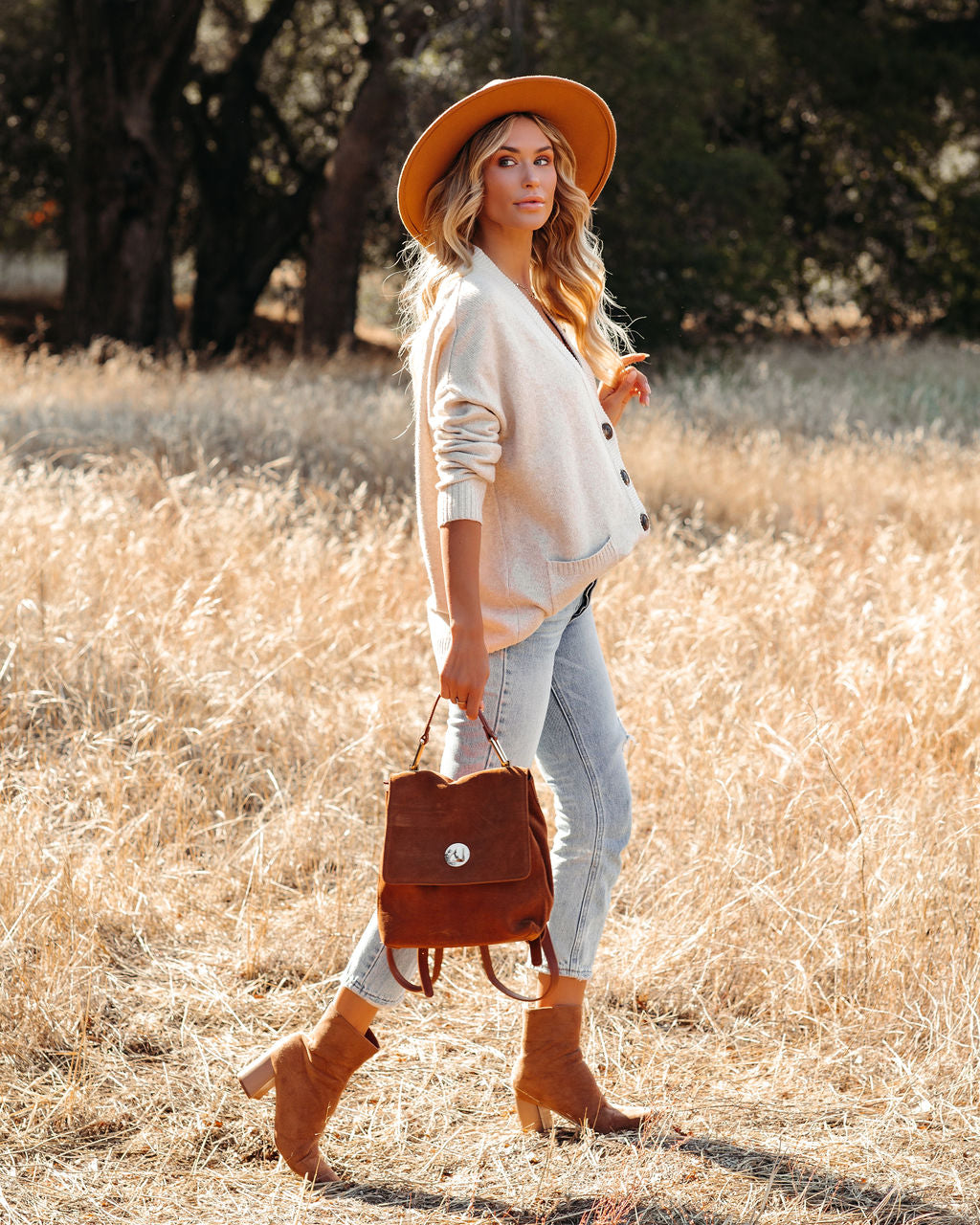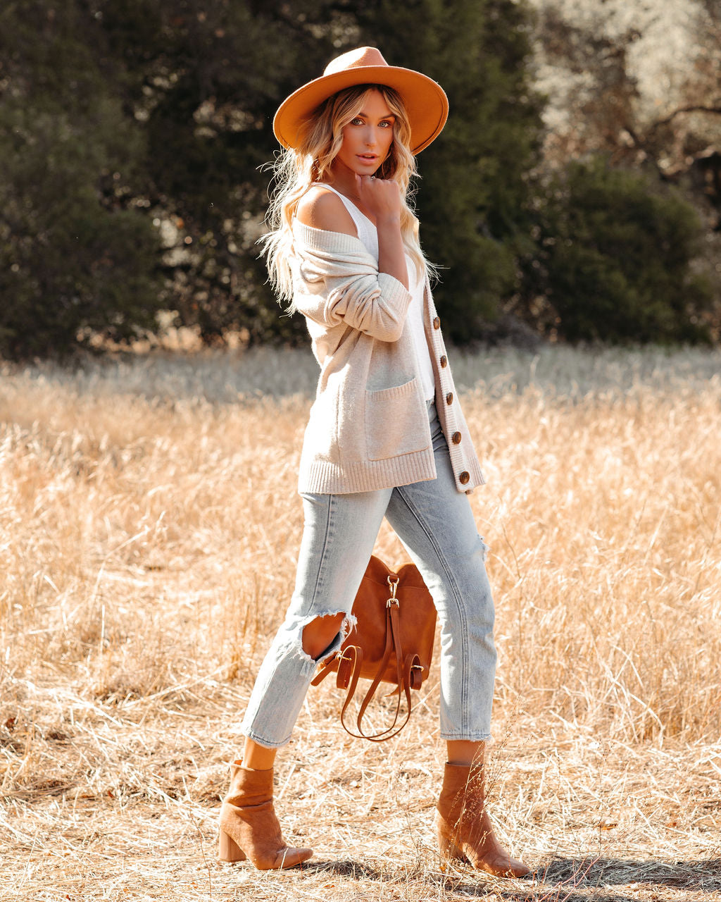 Unser Prescot Cardigan mit Knopfleiste und Taschen passt zu allem in Ihrem Kleiderschrank! Dieser haferfarbene Cardigan hat Vordertaschen und lange Ärmel. Mit Knopfverschluss vorne. Kombiniert mit dem El Dorado Hut. Perfect Creolen. Chloe Mini-Halskette. Schlichtes Armreif-Armband. Physique Racerback Tanktop. Janine Rucksack. Kason Distressed High Rise Denim. Und Colby Stiefeletten aus Wildlederimitat mit Absatz.