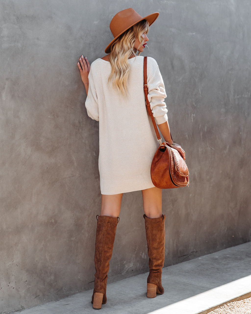 Unser Princeton Strickpulloverkleid wird Ihr neuer Lieblingsteil! Dieses steinfarbene Strickpulloverkleid hat einen weiten Ausschnitt. Tragen Sie dieses langärmelige Kleid mit Overknee-Stiefeln und einem Hut. Kombinieren Sie es mit dem El Dorado Hut, Tahiti Creolen, der Buddha Wheel Halskette, einem schlichten Armreif, einer Highland Tasche und Saint Slouch Stiefeln.