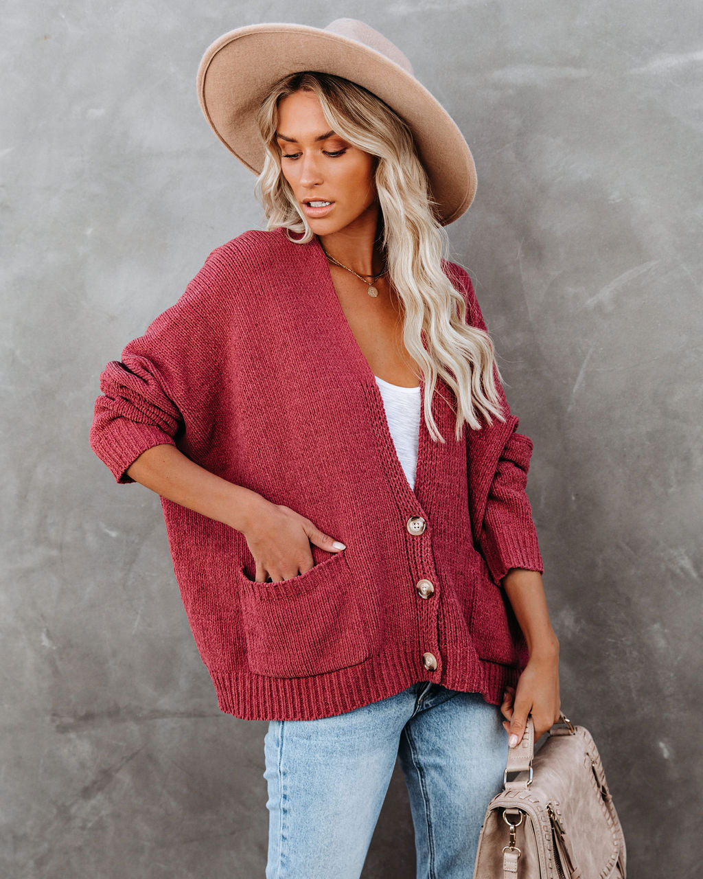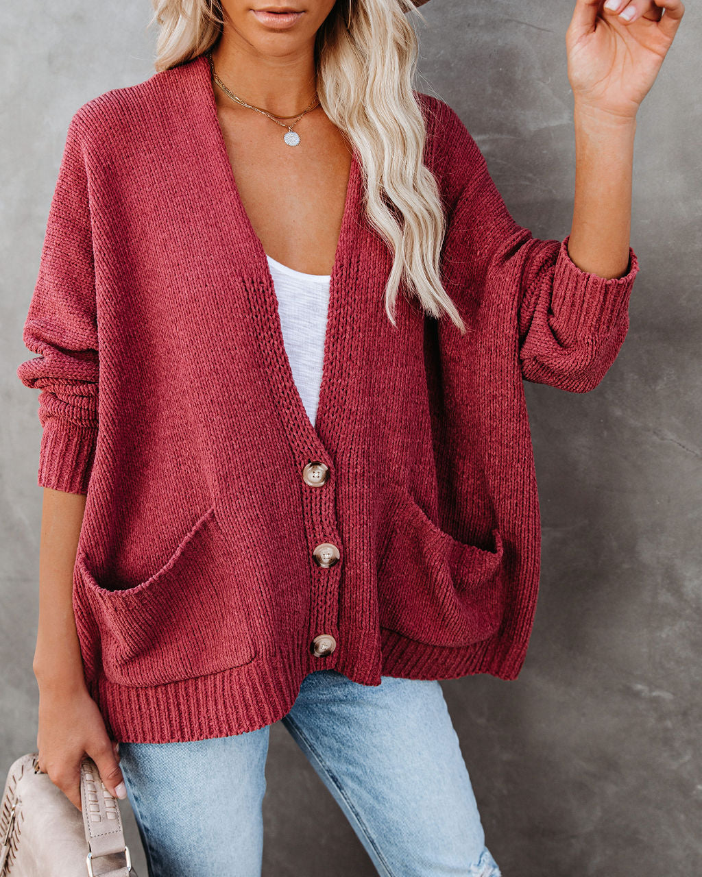 Wir lieben den Quaint Pocketed Button Front Cardigan wegen seiner übergroßen Passform und der weichen Chenille-Verarbeitung. Diese beliebte Silhouette ist in einem Vintage-Roséton mit langen Dolman-Ärmeln, Fronttaschen und Knopfverschluss gefertigt. Lässig für den Herbst!