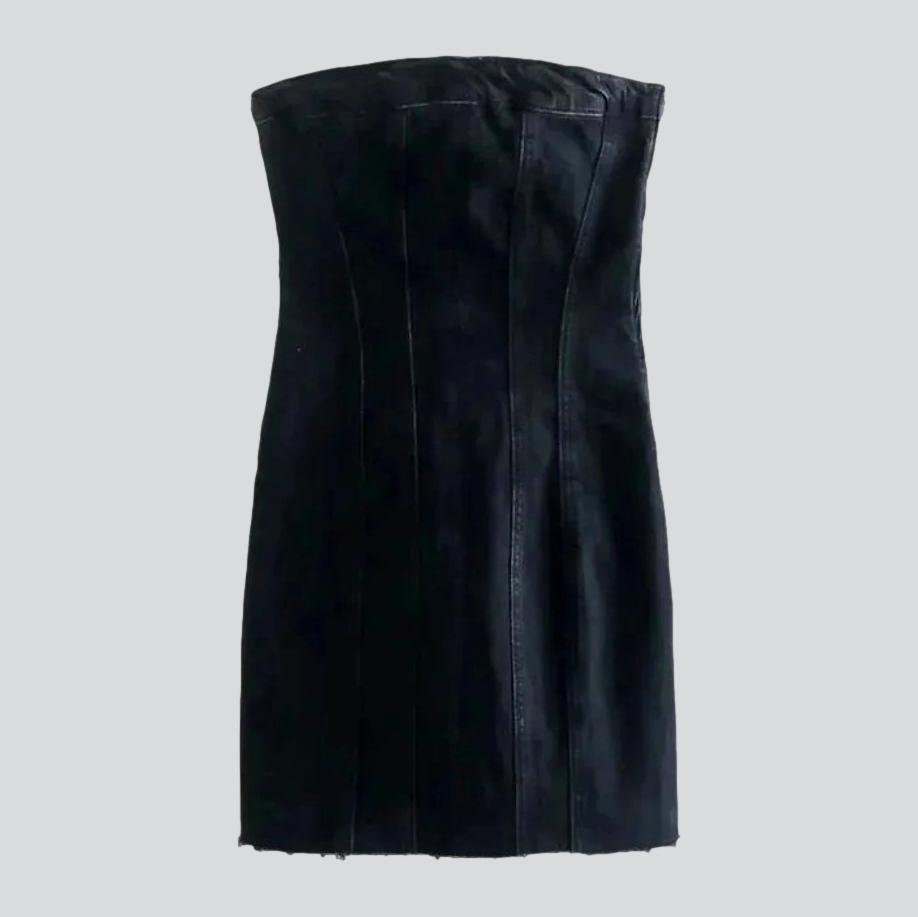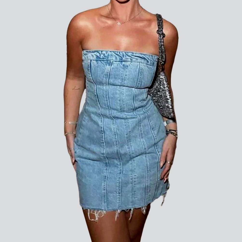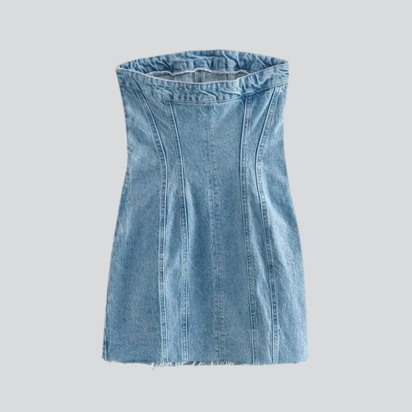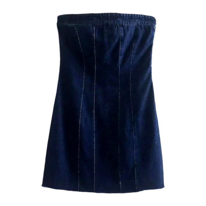 Wir präsentieren unser trägerloses Jeanskleid mit offenem Saum aus der Sommerkollektion 2023 – die perfekte Mischung aus Vintage und zeitgenössischer Mode!