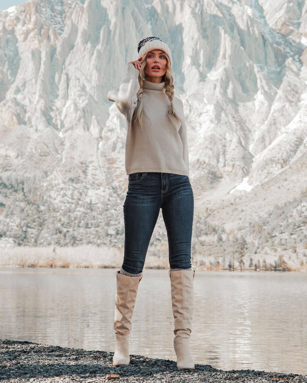 Greifen Sie zu unserem Ready Set Snow Rollkragen-Strickpullover, wenn Sie nicht wissen, was Sie anziehen sollen! Dieser aschgraue Pullover hat einen Rollkragen. Aus dickem Strick gefertigt, hält er Sie den ganzen Winter über warm! Kombiniert mit der Snow Far Snow Good Pom Beanie, der Daily High Rise Skinny und den Parker Slouch Boot.