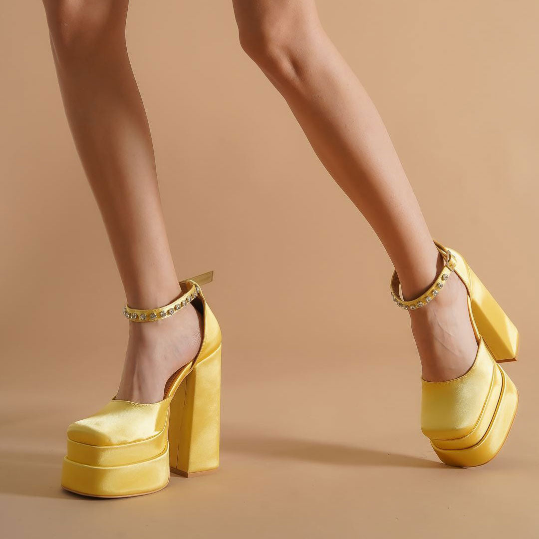 Diese luxuriösen Pumps sind ein echter Hingucker. Sie bestehen hauptsächlich aus glatt glänzendem Satin in Bonbonfarben. Der strassbesetzte Knöchelriemen mit Schnallenverschluss fällt auf. Die quadratische, geschlossene Spitze ist mit Kunstleder gefüttert. Das zweistufige Plateau mit Blockabsatz und einem Gummi-Patch am Abschluss rundet das Design ab. Weitere trendige Damen-Pumps mit hohen Absätzen und einzigartige Schuhe finden Sie in unserer Boutique. Kombinieren Sie sie mit einem Minikleid mit Puffärmeln und einem mehrlagigen Haarband – Absatzhöhe: 14,5 cm.