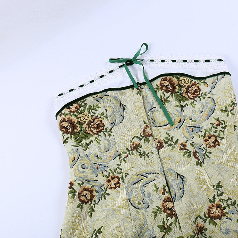 Das Minikleid „Spoil Me Vintage Corset Style“ ist ein trägerloses Kleid im Korsettstil mit einem Frontverschluss und Spitzendetails an der Brust.