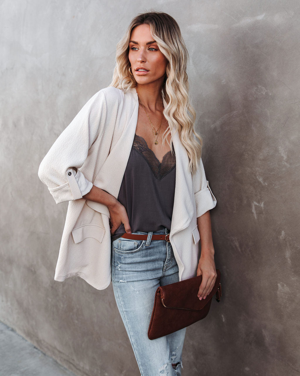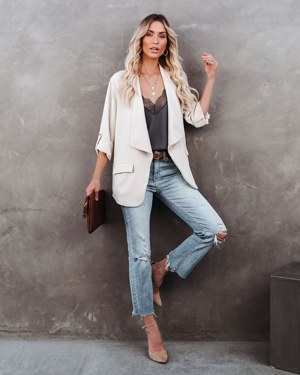 //Bestseller// Unser Streamline Pocketed Textured Blazer in Natur ist ein echter Büro-Chic! Mit fließender, offener Vorderseite und Ärmeln, die mit einer permanenten Rolllasche gesichert sind. Die leicht strukturierte Verarbeitung unterstützt die mühelose und entspannte Passform und lässt sich leicht mit Basic-T-Shirts und sogar Pullovern kombinieren! Mit zwei Fronttaschen. Kombiniert mit der Double Disc Layered Necklace. Stella Crossbody Envelope Zip Clutch. Delicate Balance Lace Cami Tank. Token Kunstledergürtel. McGuire High Rise Distressed Denim. Und Ritz Faux Suede Pointed Heel.