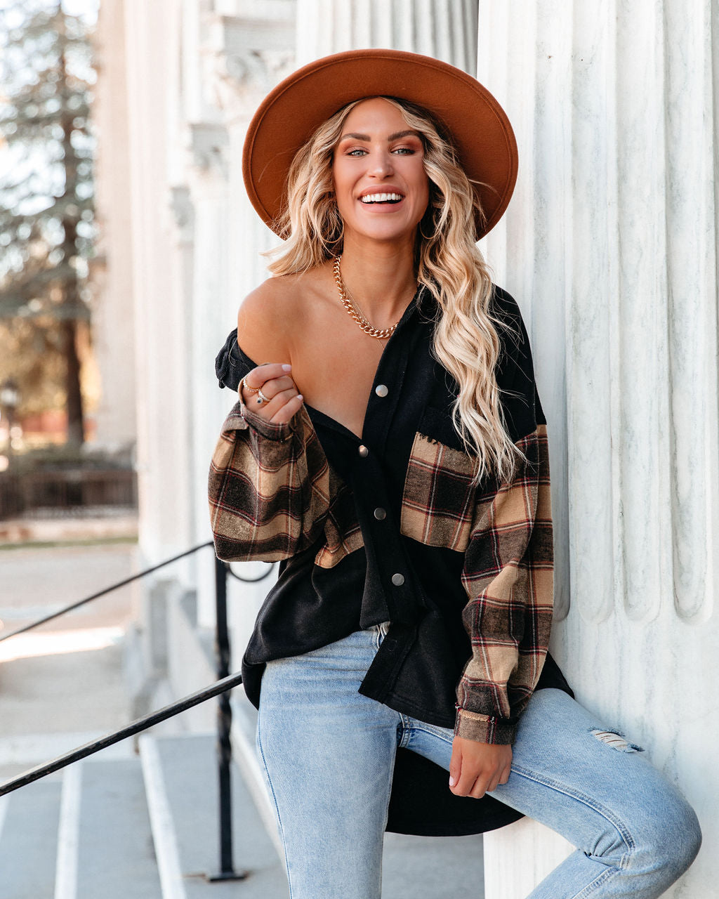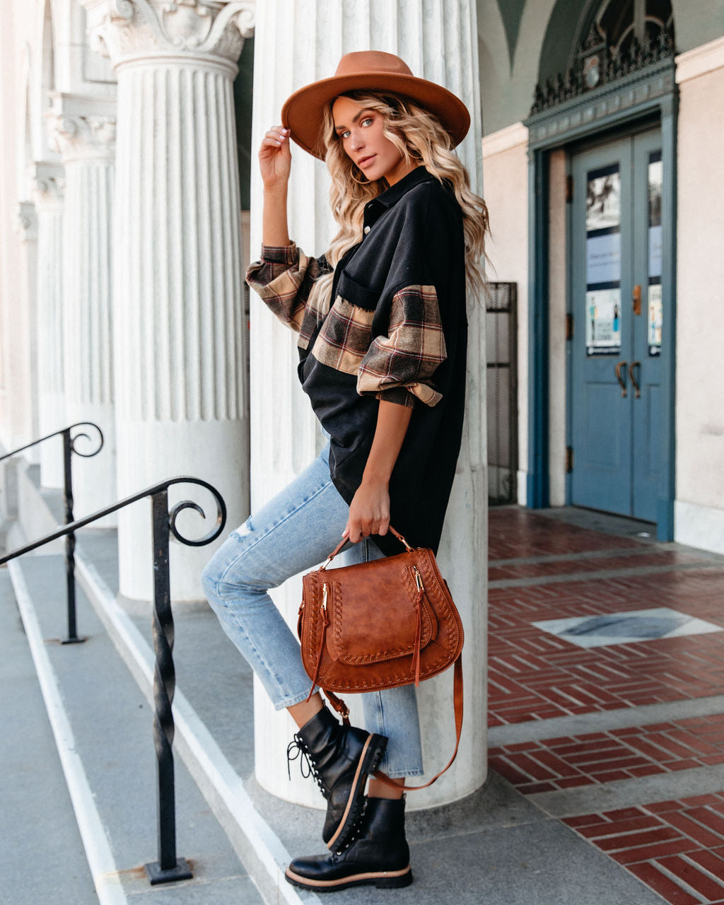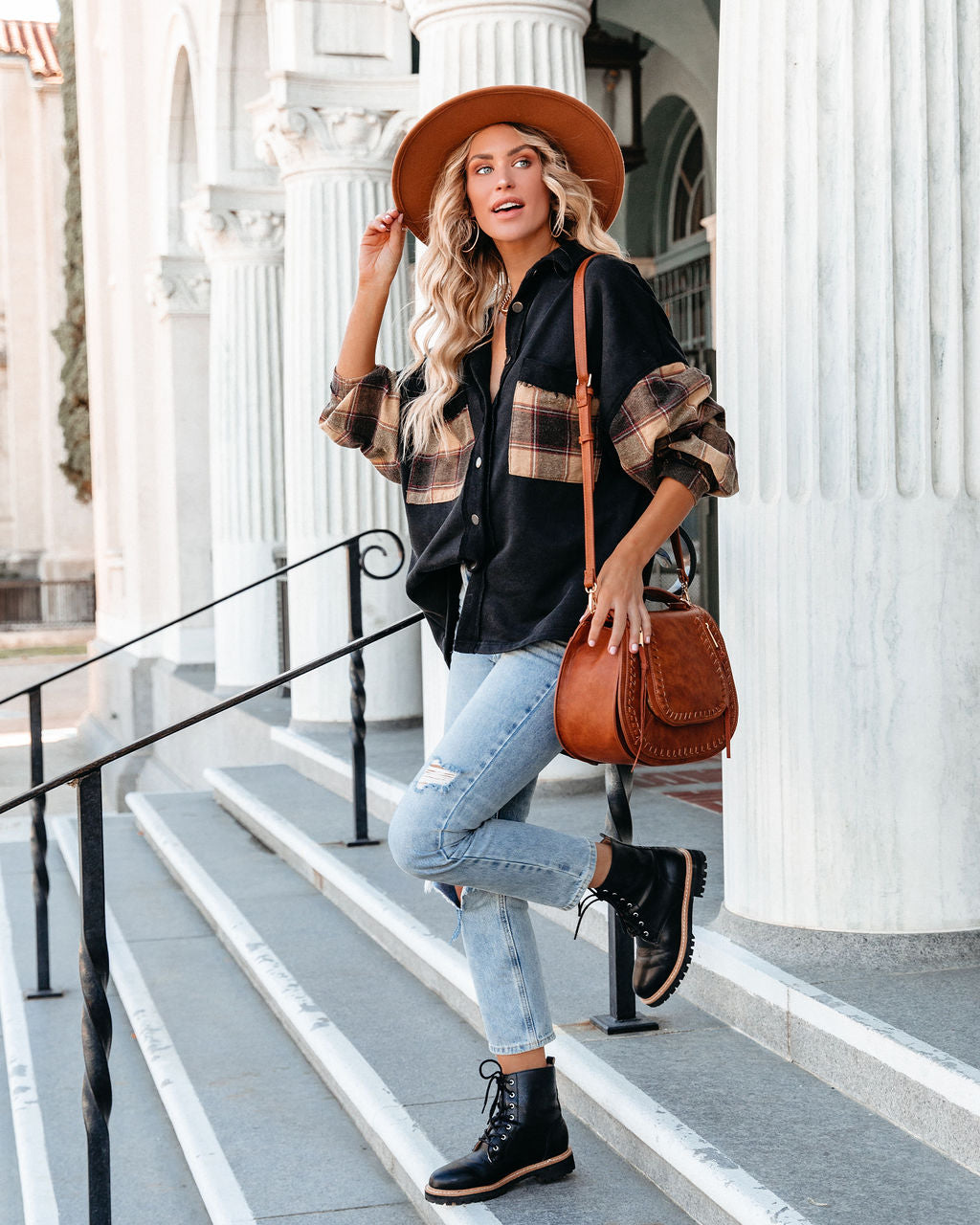 Keine gewöhnliche Shacket! Unsere Taron Cotton Blend Contrast Plaid Shacket ist schwarz mit Dijon- und Rot-Karo-Tönen. Mit Brusttaschen und hohem, tiefem Saum. Geschlossen wird sie mit Knopfverschluss vorne. Kombiniert mit dem El Dorado Hut. Perfekte Creolen. Mica Chain Choker Halskette. Initialen-Kartenkette. Highland Bag. Kason Distressed High Rise Denim. Und Brycen Kunstleder-Schnürstiefel.