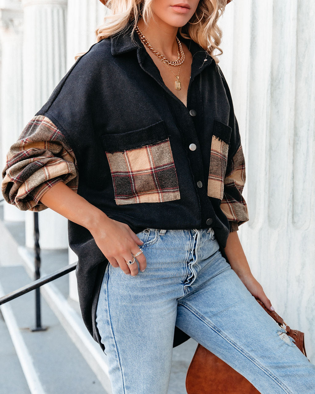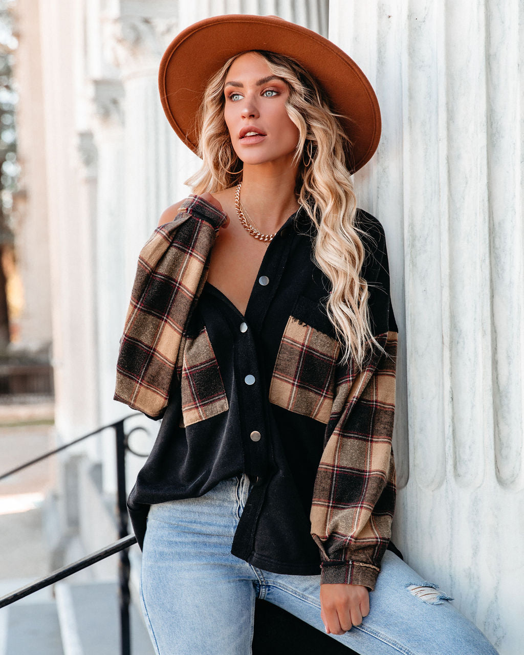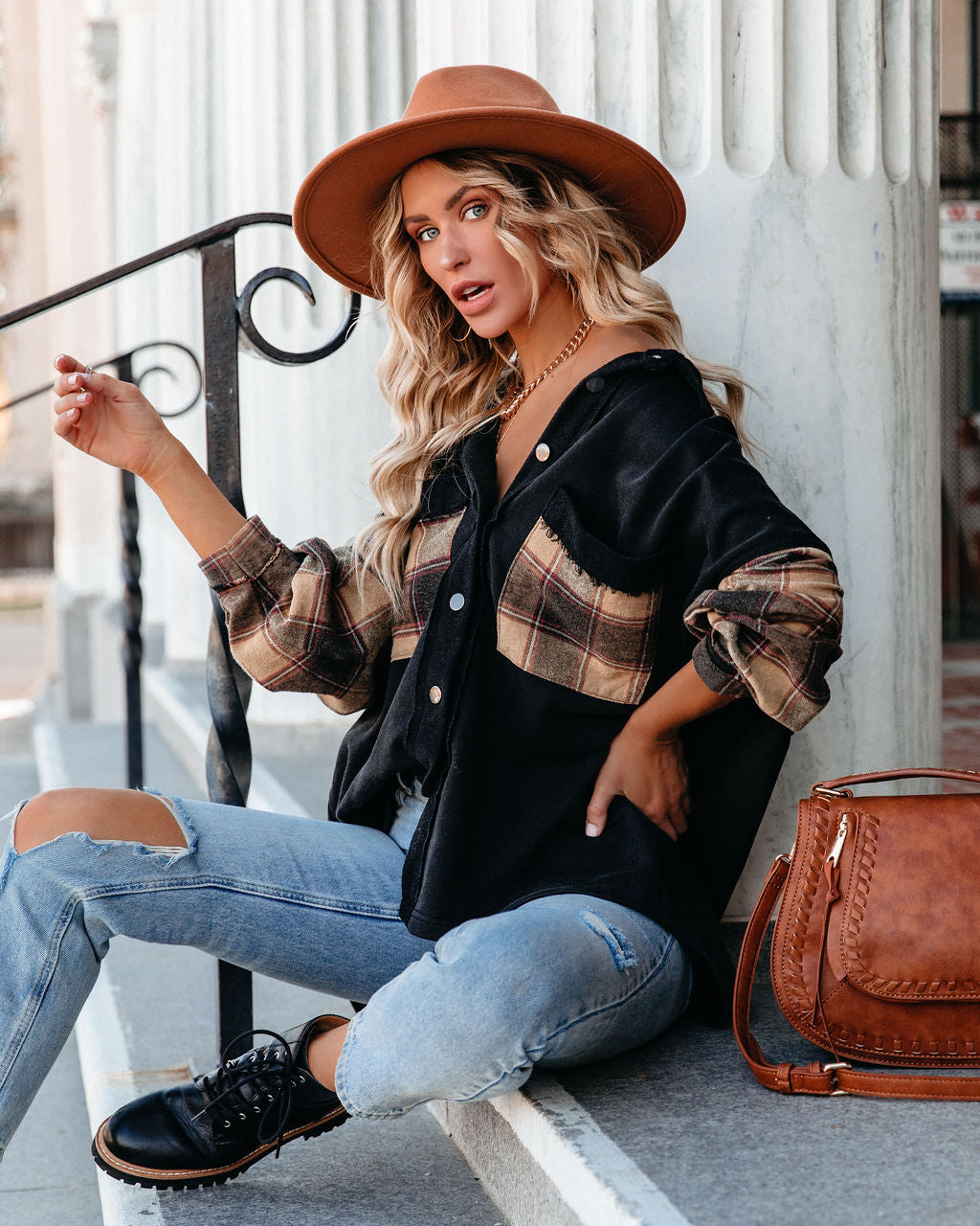 Keine gewöhnliche Shacket! Unsere Taron Cotton Blend Contrast Plaid Shacket ist schwarz mit Dijon- und Rot-Karo-Tönen. Mit Brusttaschen und hohem, tiefem Saum. Geschlossen wird sie mit Knopfverschluss vorne. Kombiniert mit dem El Dorado Hut. Perfekte Creolen. Mica Chain Choker Halskette. Initialen-Kartenkette. Highland Bag. Kason Distressed High Rise Denim. Und Brycen Kunstleder-Schnürstiefel.