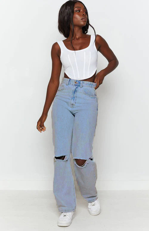 //Bestseller-Silhouette// Unser Tayden High Rise Distressed 90er Flare Denim verleiht einen coolen Look! Diese graue High-Rise-Hose hat Distressed-Details an den Knien. Ohne Stretch und mit 5 Taschen. Kombiniert mit der Lenox Pilotenbrille mit schwarzem Rahmen und grauem Farbverlauf. Schlichter Armreif. Kompass-Münzkette. Minimalistische Fischgrätenkette. Stella Crossbody-Clutch mit Umschlag und Reißverschluss. Kiki Strick-Crop-Top. Gramercy Kunstleder-Motorradjacke mit Taschen. Und Whimsy Heel.