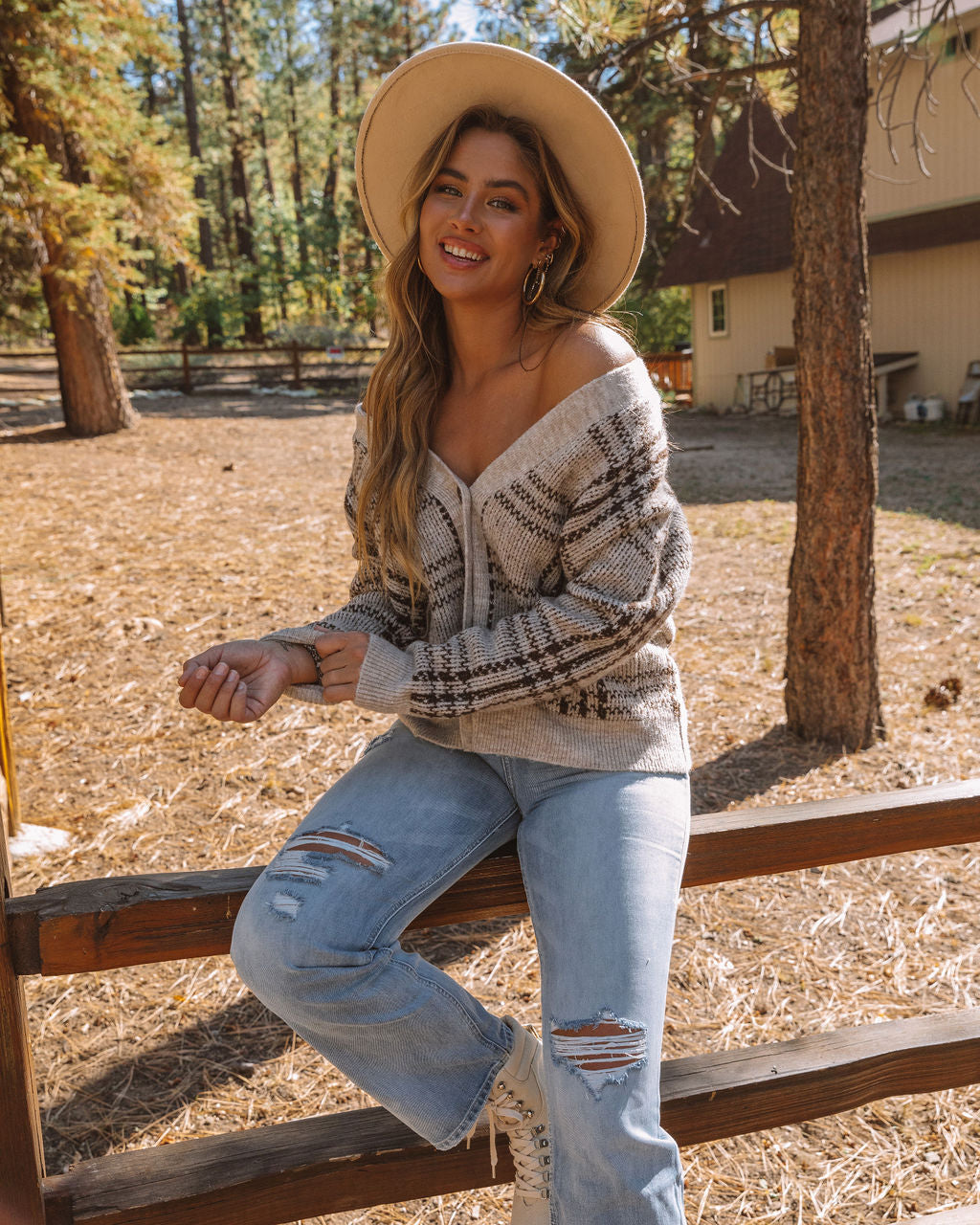 Machen Sie es sich diesen Herbst in unserem Torrington Pocketed Plaid Button Front Cardigan gemütlich! Dieses naturbraune Karomuster hat Fronttaschen. Mit langen Ärmeln und Knopfverschluss vorne. Wir lieben es, wie offen oder geschlossen er getragen werden kann! Kombiniert mit dem Rocky Mountain Hat, Zoey Hoops, Jadine High Rise 90's Boyfriend Denim und Sweeney Canvas Schnürstiefeln.