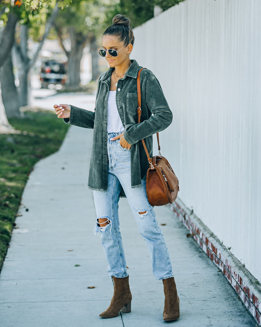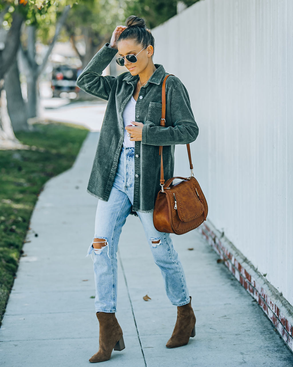 Schnappen Sie sich unsere Tristan Shacket aus ausgefranstem Baumwollcord, bevor sie vergriffen ist! Diese olivfarbene Shacket hat Brusttaschen und einen ausgefransten Saum. Mit Knopfverschluss vorne. Kombiniert mit der Chloe Mini-Kette, der Mosaik-Münzkette, der Highland-Tasche, dem schlichten Armreif, dem Physique Racerback-Tanktop, der Kason Distressed High Rise Denim und den Colby Boots aus Wildlederimitat mit Absatz.