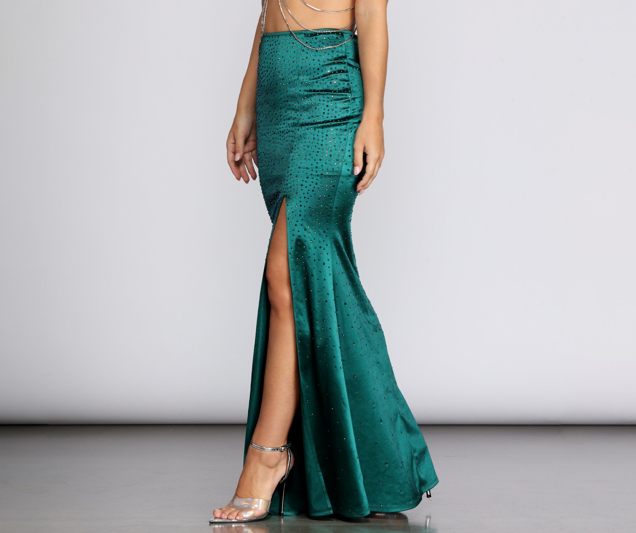 Gönnen Sie sich an Halloween einen glamourösen Auftritt unter Wasser mit diesem bezaubernden Kostüm. In diesem smaragdgrünen Maxirock. Er hat eine hohe Taille mit sichtbarem Reißverschluss hinten, schillernde Strasssteine und einen verführerischen Beinschlitz. Der Rock ist kurz gefüttert und bietet moderaten Stretch. Vervollständigen Sie den Look mit der passenden Meerjungfrauenkrone und dem passenden Bustier!