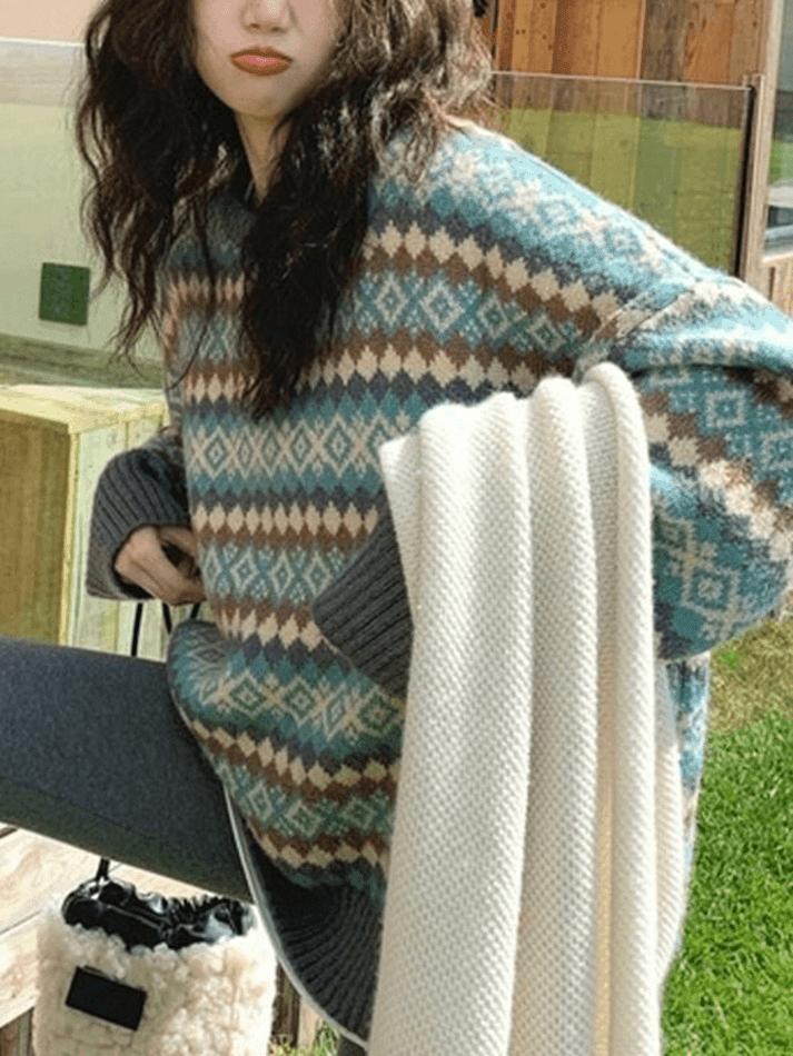 Stil: Lässig/Straße/Vintage/Preppy/Süß Material: Polyester, Acryl Passform: Lockere Passform Ausschnitt: Rundhals Ärmellänge: Langarm Beschreibung: Verleihen Sie Ihren gemütlichen Pullovern einen Hauch von Vintage. Die besonders schmeichelhafte Silhouette mit langen, überschnittenen Ärmeln besticht durch ein geometrisches Jacquard-Muster. Der gerippte Kragen, die Bündchen und der Saum sind ein Hingucker.