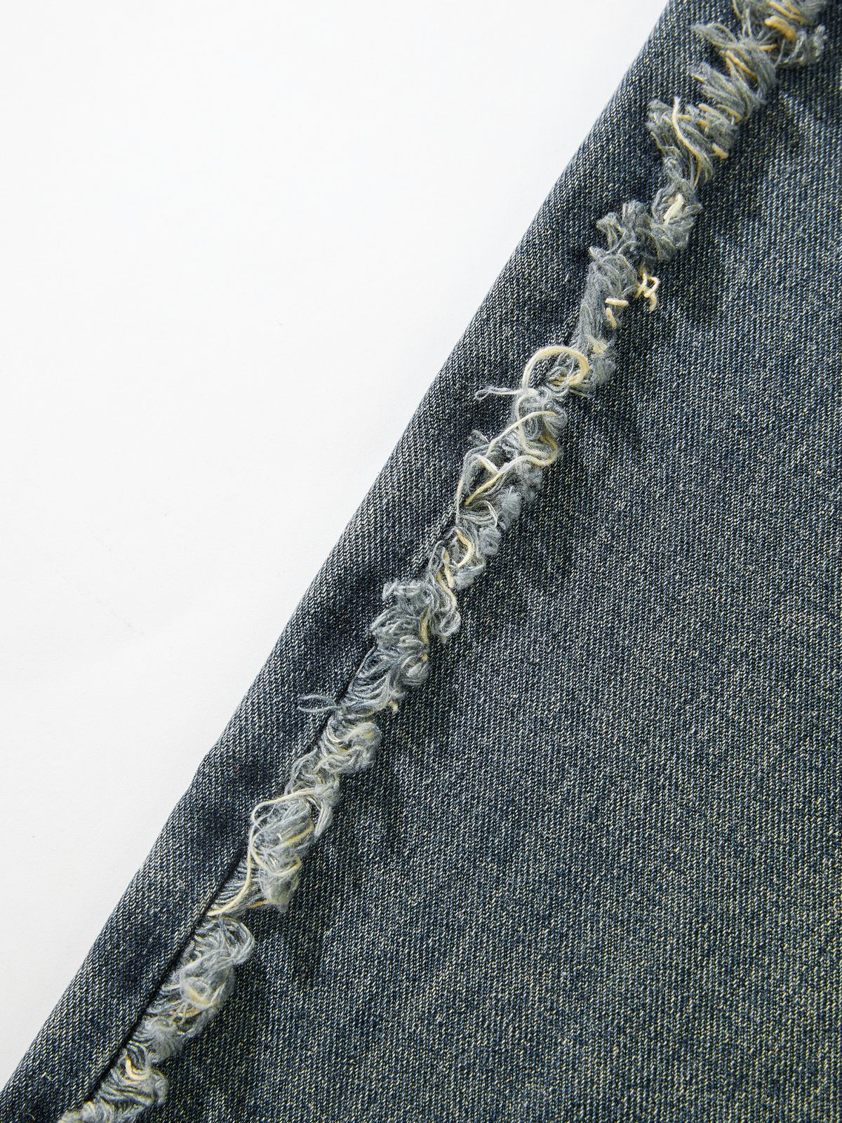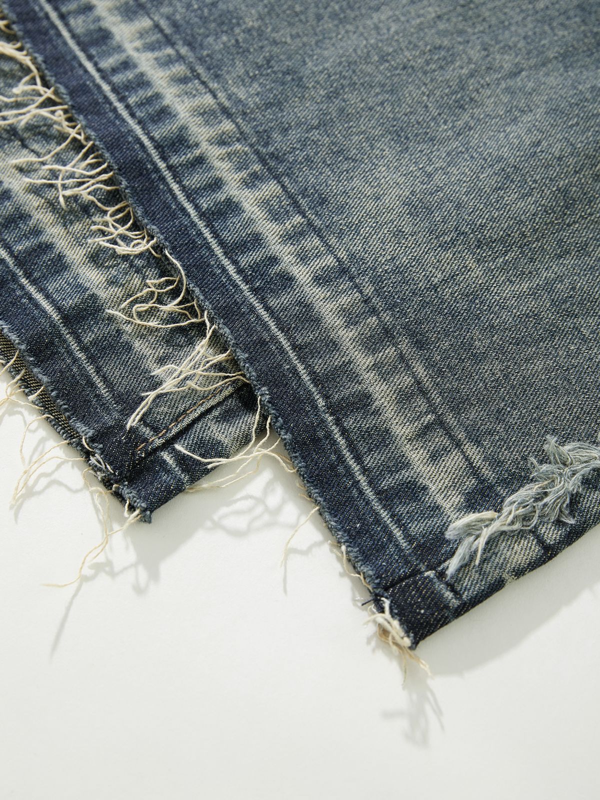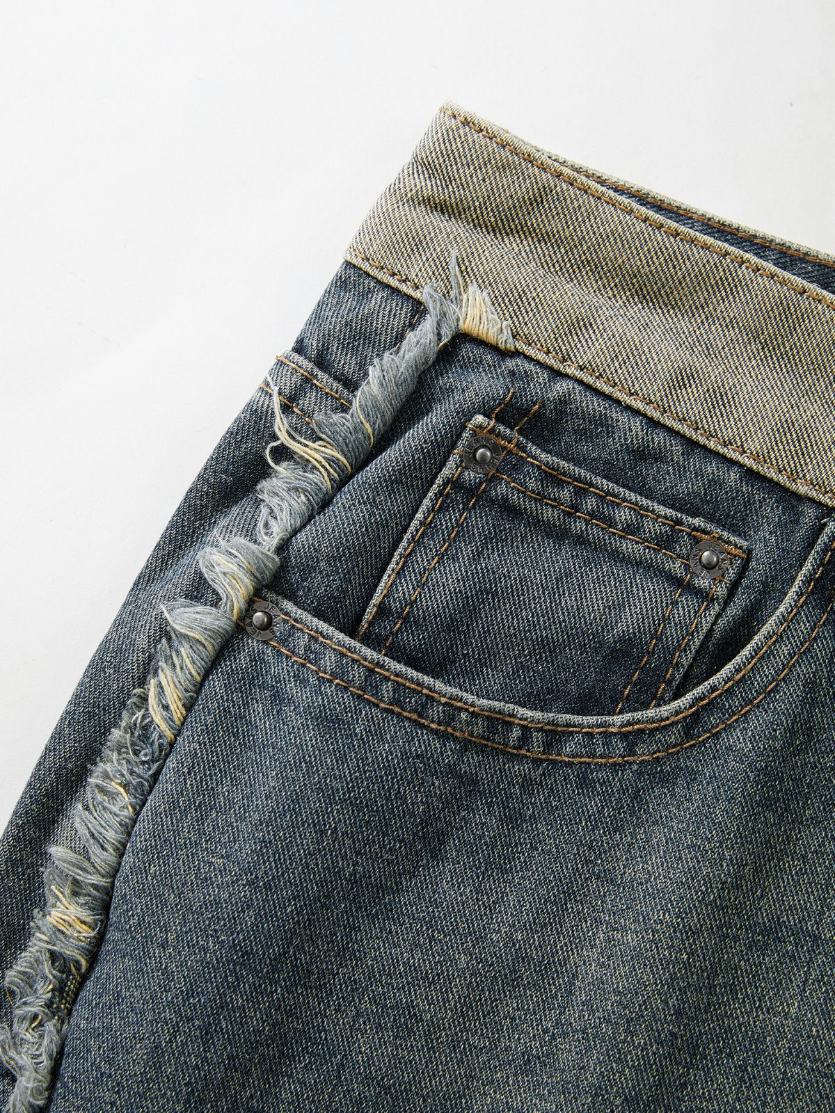Beschreibung: Diese Retro-Jeans aus Baumwollmischgewebe mit Säurewaschung hat ausgefranste Einsätze an der Seite. Im 5-Taschen-Stil. Mit Reißverschluss mit Metallknöpfen. Und leicht abgenutztem Saumdesign.