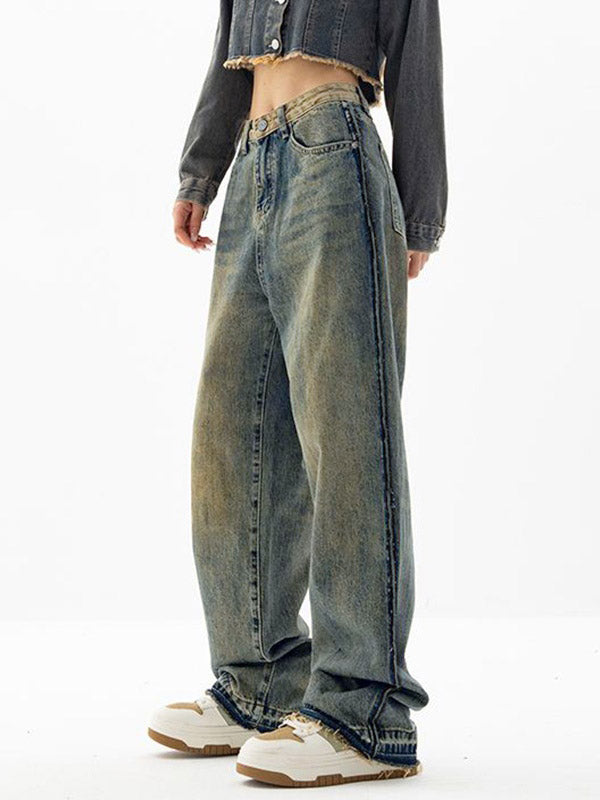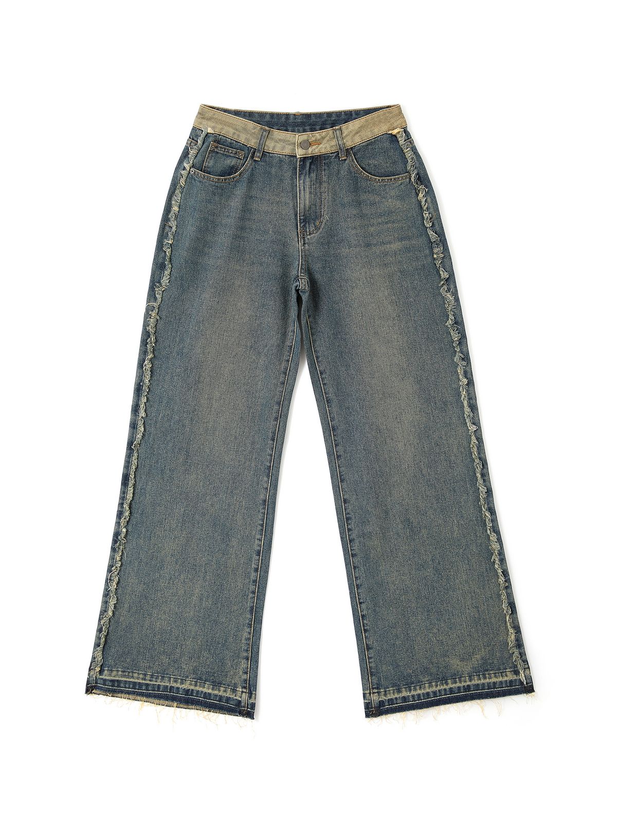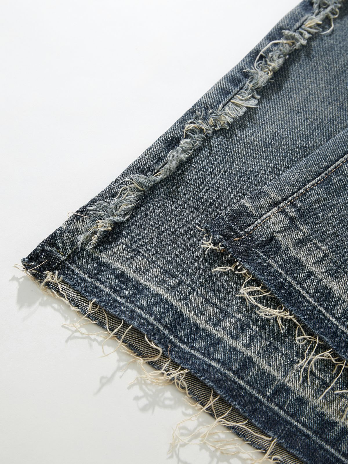 Beschreibung: Diese Retro-Jeans aus Baumwollmischgewebe mit Säurewaschung hat ausgefranste Einsätze an der Seite. Im 5-Taschen-Stil. Mit Reißverschluss mit Metallknöpfen. Und leicht abgenutztem Saumdesign.