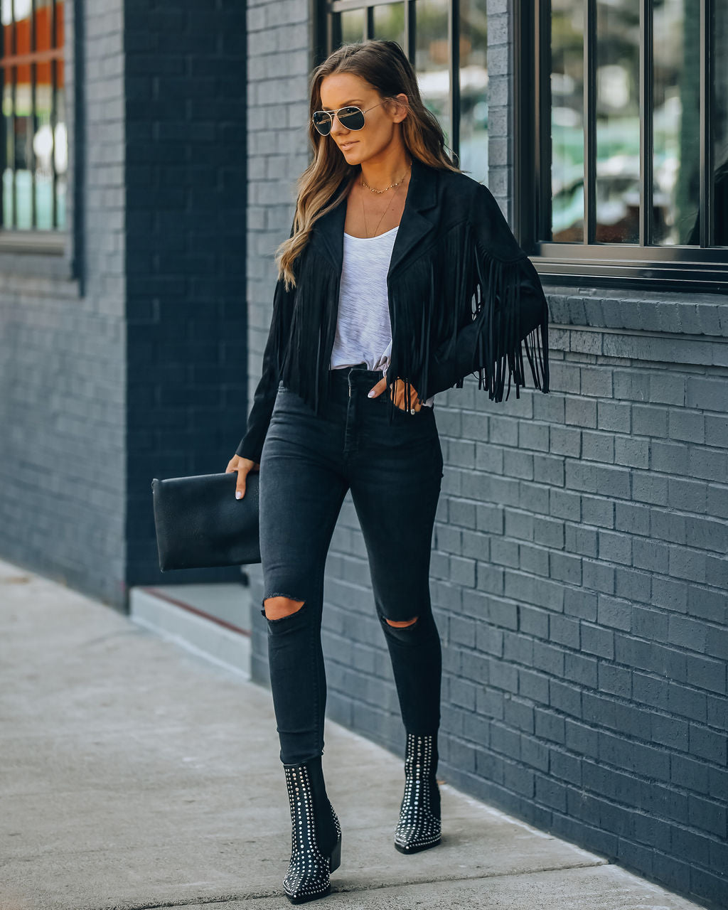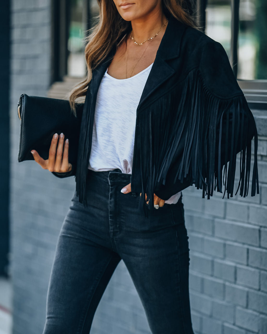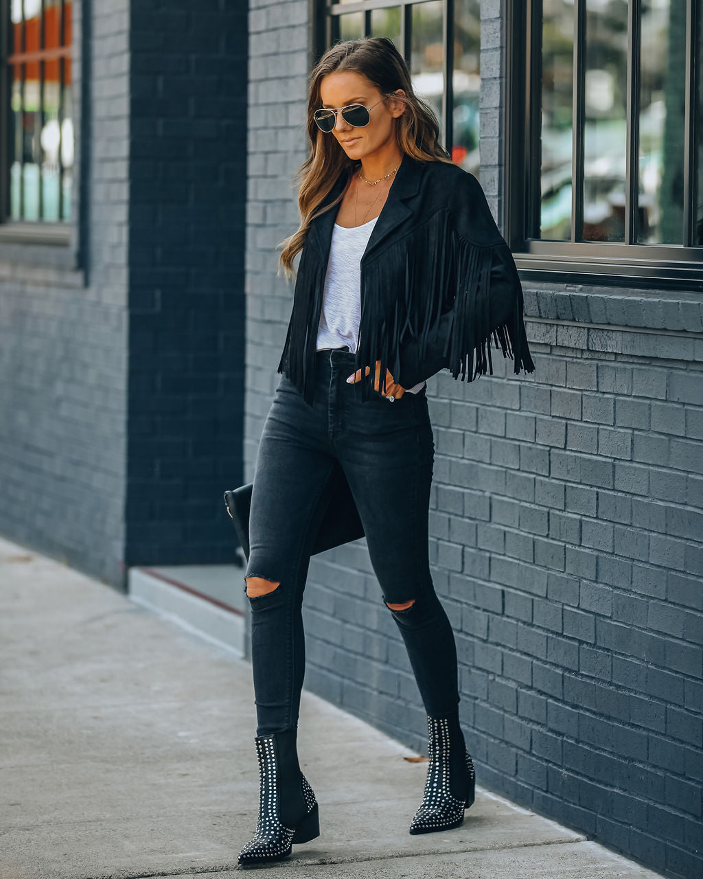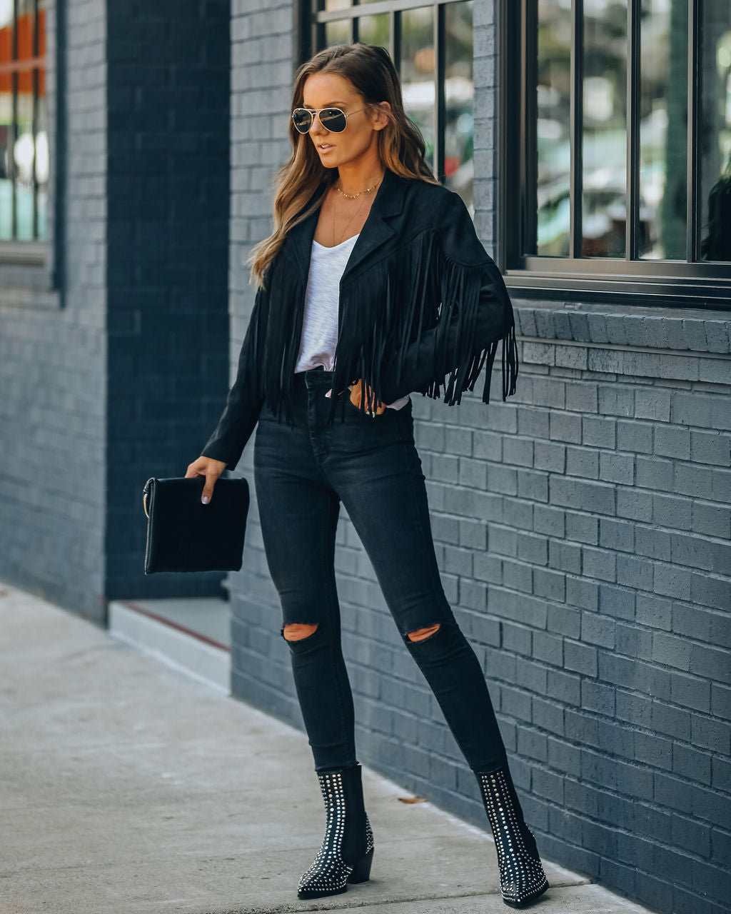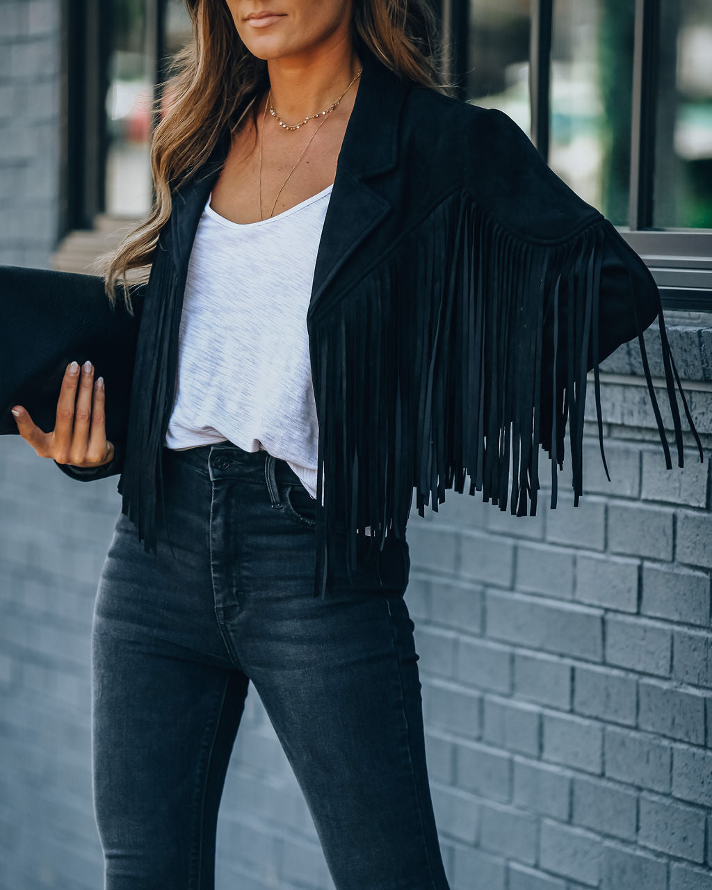 //Bestseller// Die Walford Cropped Fringe Faux Suede Jacket verleiht uns schicke Western-Vibes in einem unvergesslichen schwarzen Premium-Wildlederimitat mit Reverskragen.