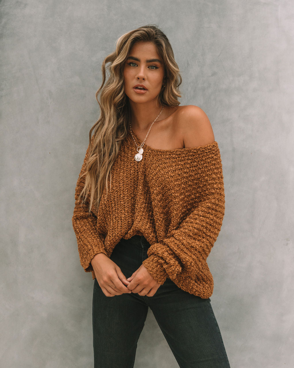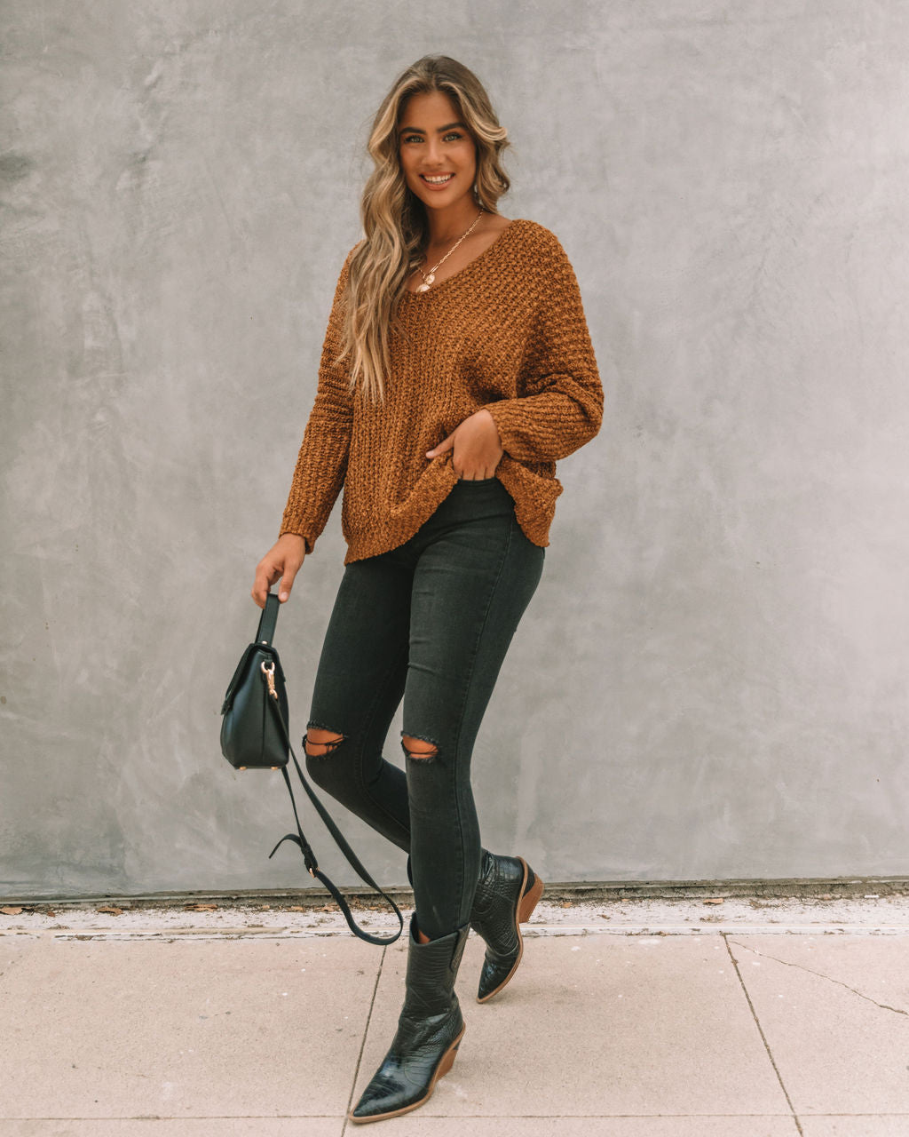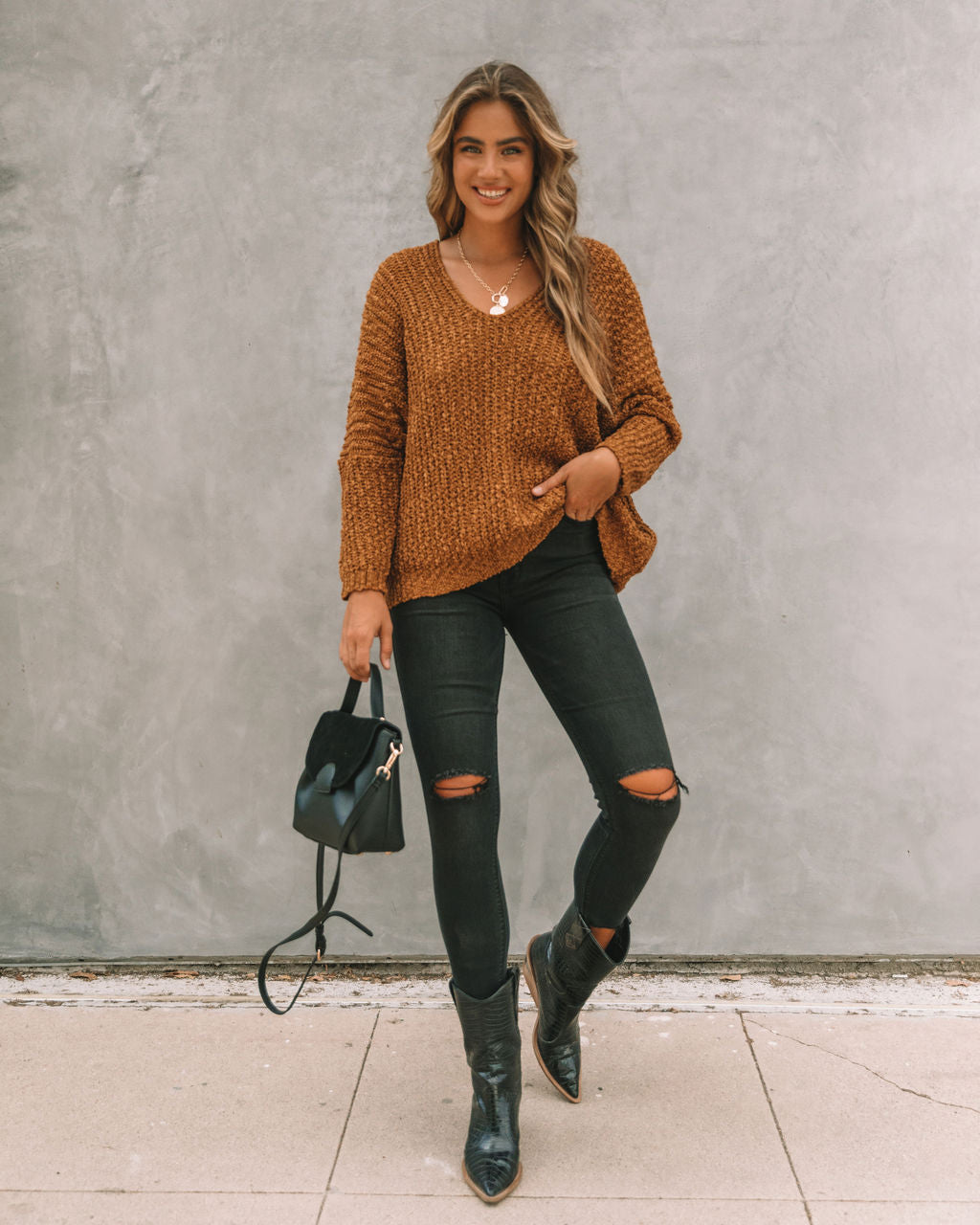 //Bestseller//Neue Farbe// Unser Warms My Soul Strickpullover ist super gemütlich! Dieser lässige Strickpullover in Kamelfarbe sitzt perfekt lässig und lässt sich gut in Jeans stecken. Mit abgerundetem V-Ausschnitt. Kombiniert mit der Republique Dual Pendant Halskette, der Alana Crossbody-Handtasche und der Volt High Rise Distressed Skinny.