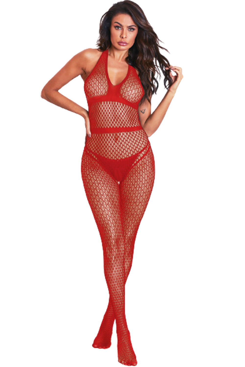 Halter Neck Open Back Netted Contrast Halter Crotchless Bodystocking