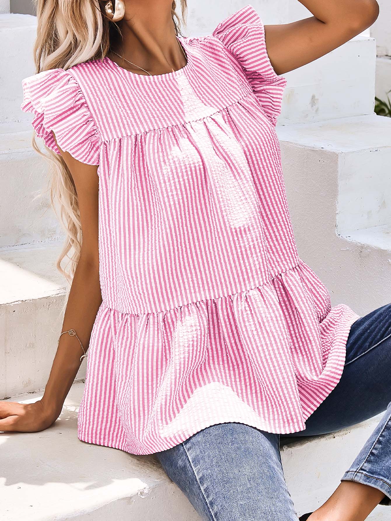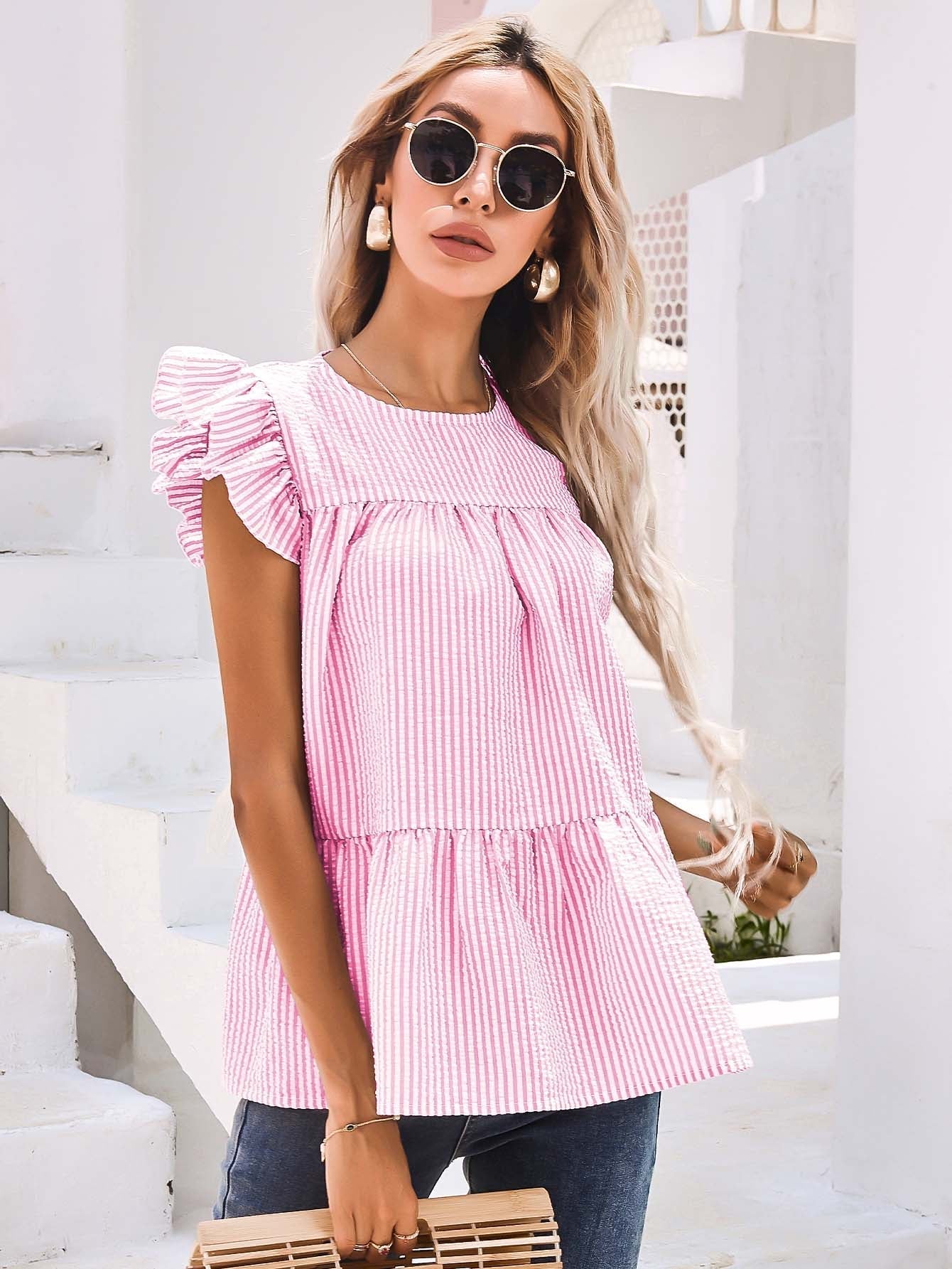Keyhole Back Ruffle Detail Striped Top Sai Feel