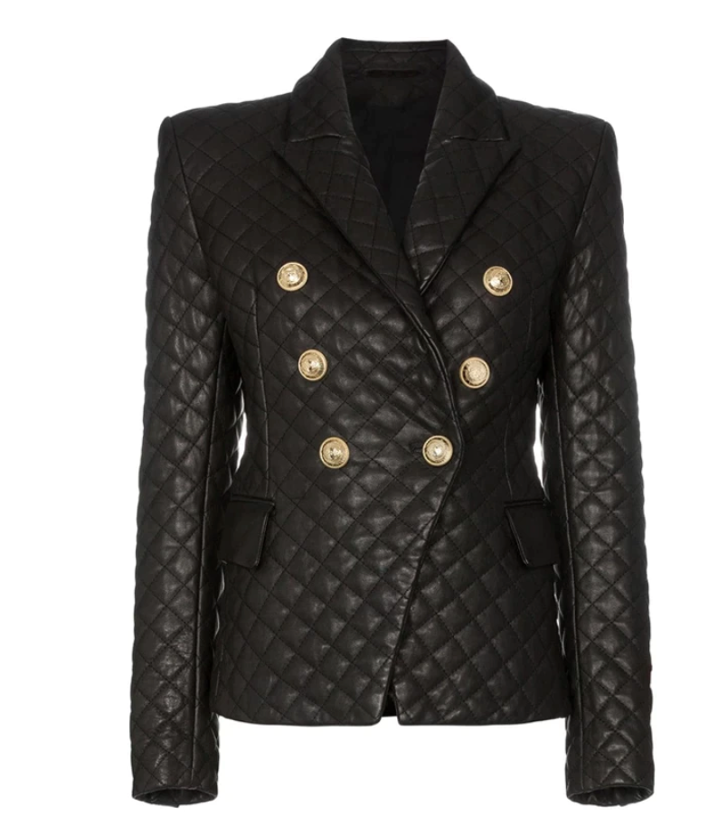 Our Arlene Quilted Leather Blazer is an all-time classic. Made of thick quality vegan leather. this piece is perfect for colder weather to keep you warm and stylish. a fitted design. peak lapels. and gold buttons add this Arlene Quilted Leather Blazer glam and elegance. Wear it with a black dress or skinny jeans or pair it with a matching skirt for a full glam look!