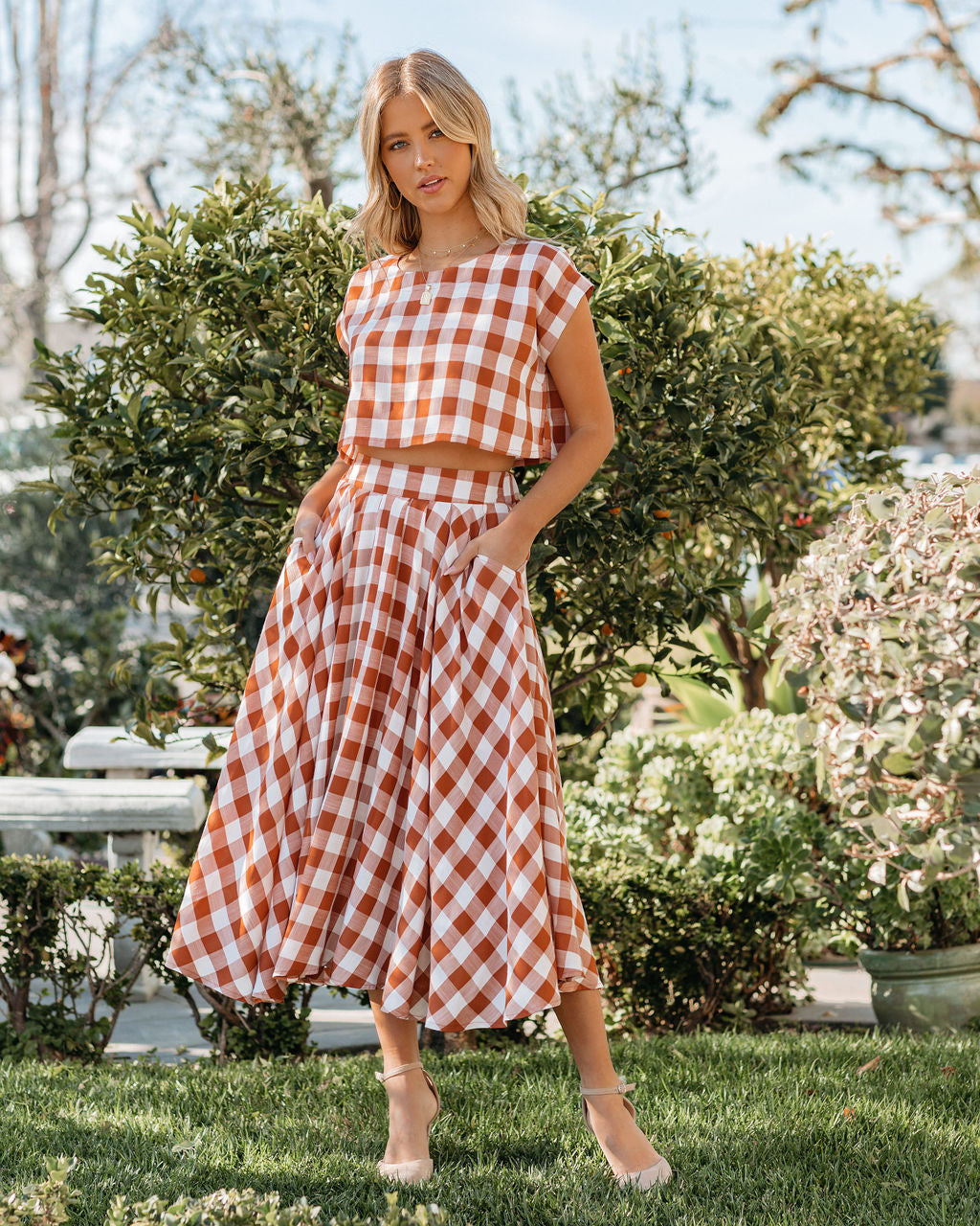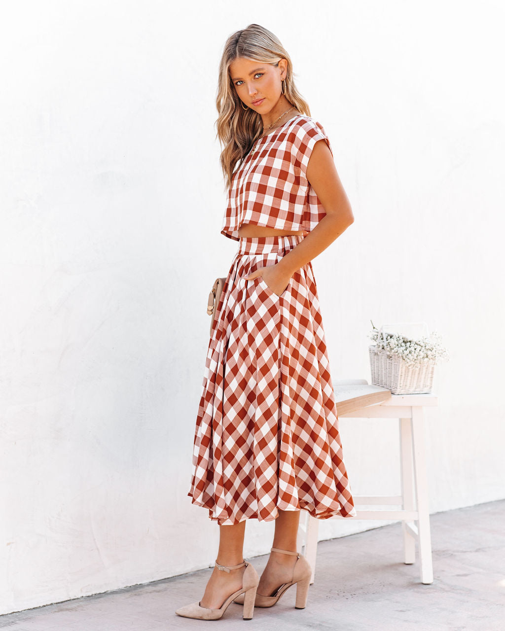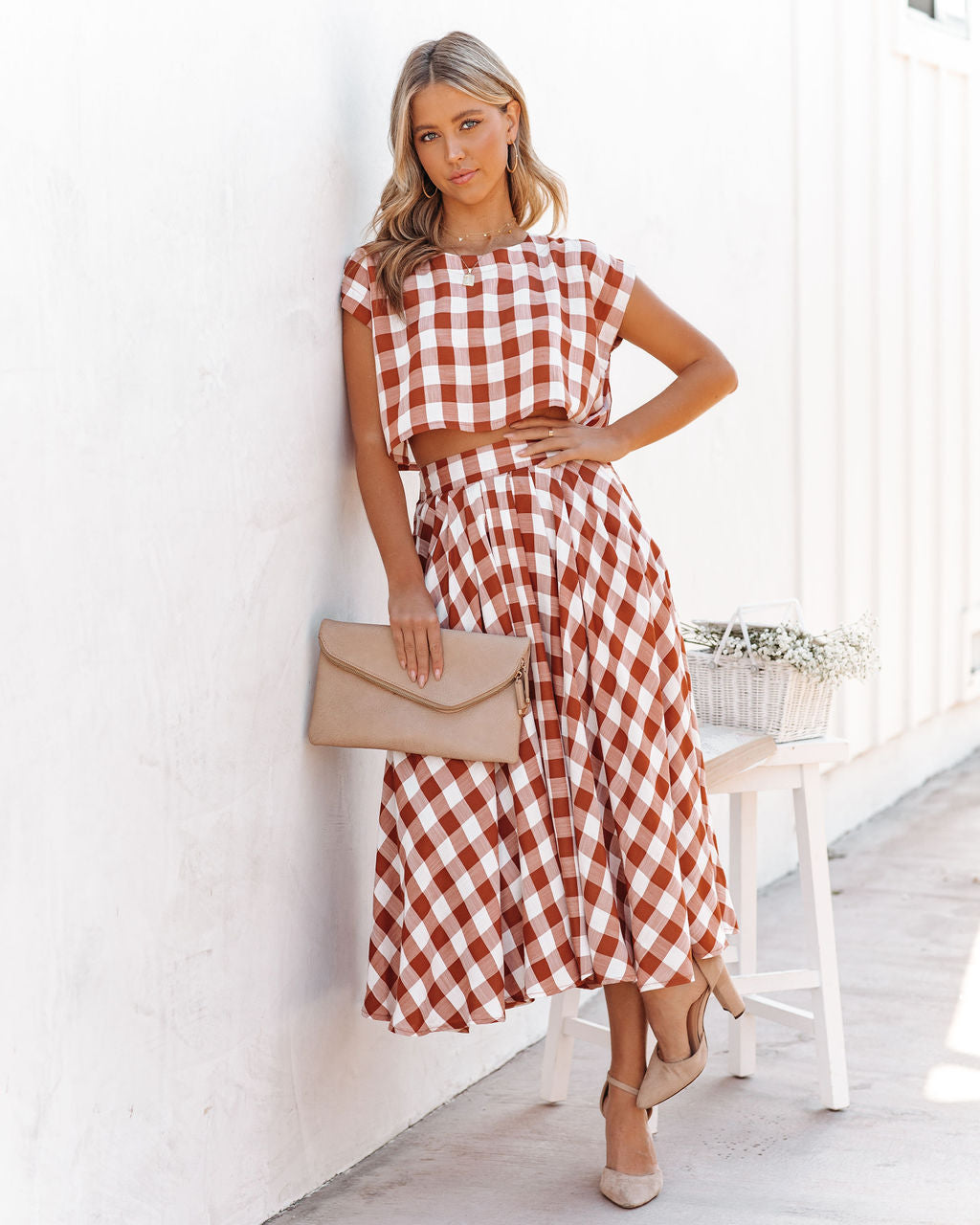 This gingham set is picnic perfect! Our Athina Cotton Blend Pocketed Midi Skirt features rust and off white squares. Designed with side pockets and a flowy skirt. Made in a super lightweight fabrication. Styled with the Roxy Hoops. 5 Disc Choker. Initial Card Necklace. Stella Crossbody Envelope Zip Clutch. Athina Cotton Blend Gingham Crop Top. and Ritz Faux Suede Pointed Heel.