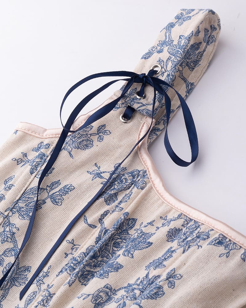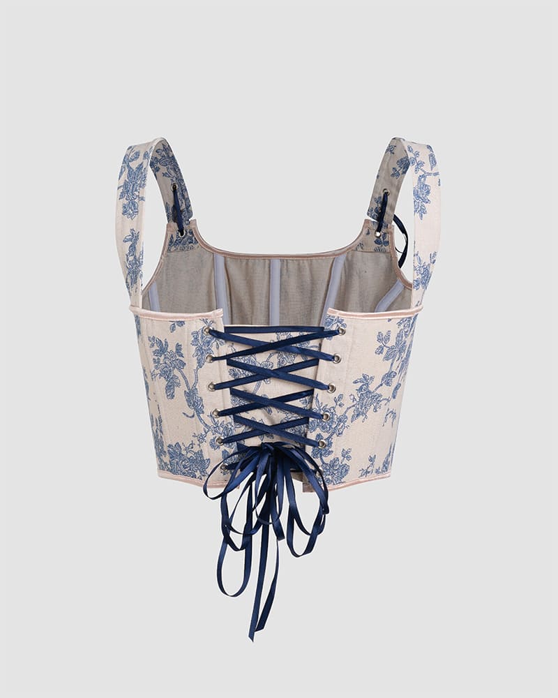 Details: Ribbon corset top with blue floral prints