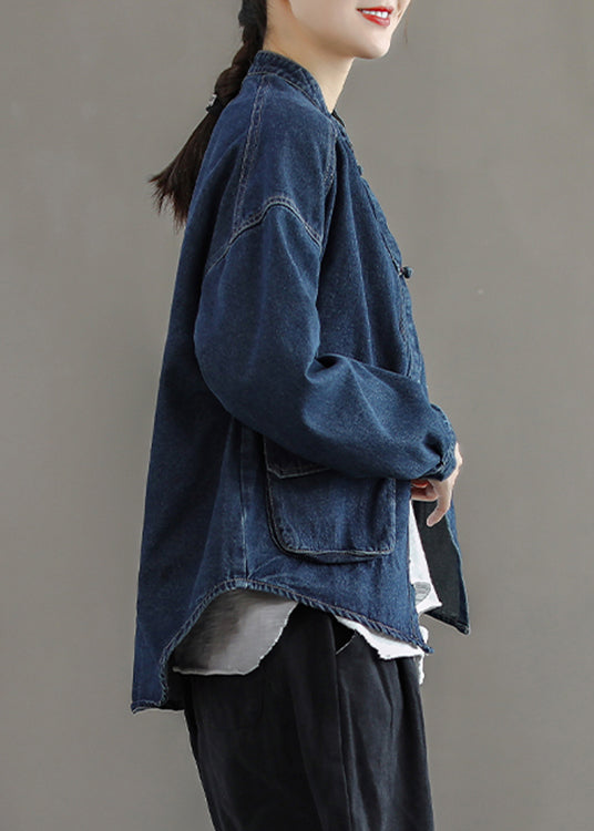 Brief Navy Stand Collar Button Pockets Cotton Denim Coats Long Sleeve Fabric: Cotton Size & Fit: Fit: This garment fits true to size. Length: Size XL measures 28.08"from shoulder to hem Bust: Great for any cup size. Waist: Loose Fit. Comfortable room throughout midsection. Hip: Loose Fit - room for hips. Hand Wash Cold.