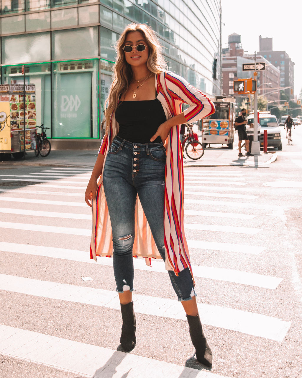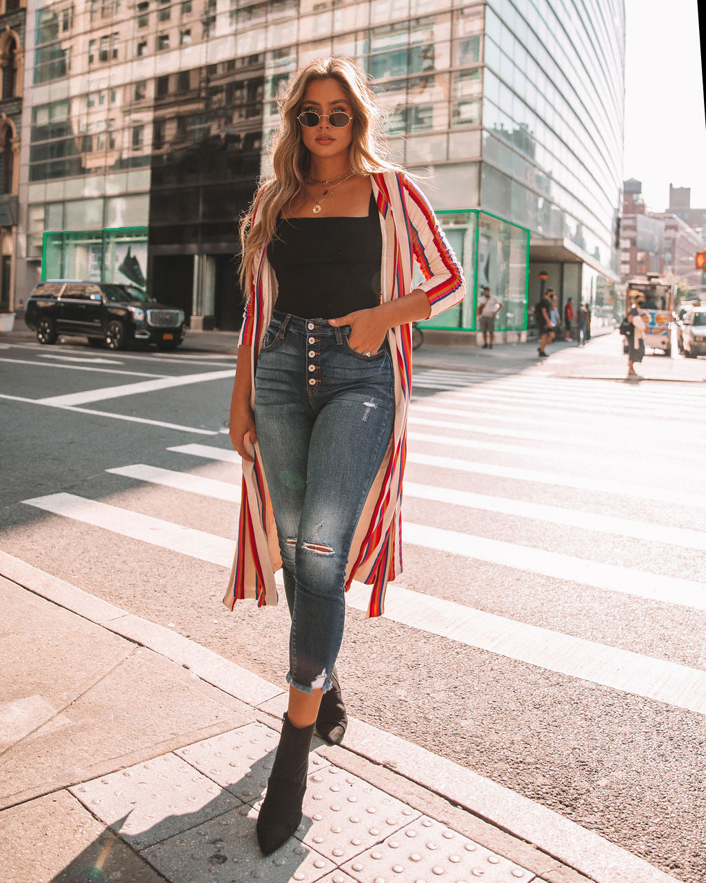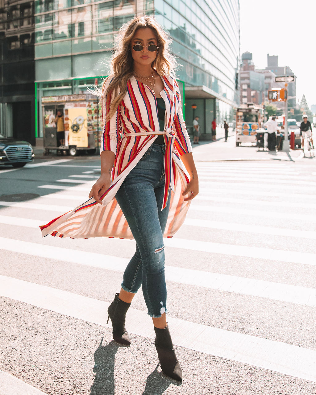 Look on the bright side! We love this rainbow-bright print of orange. red. yellow. magenta. and cobalt stripes! The soft knit feel of our Bright Side Duster Cardigan in this beige base color. Complete with an open neckline and waist tie! Styled with Coasta Layered Pendant Necklace. Making Moves Bodysuit. Tilley Frayed Ankle High Waisted Skinny. and Britt Faux Suede Heeled Bootie.