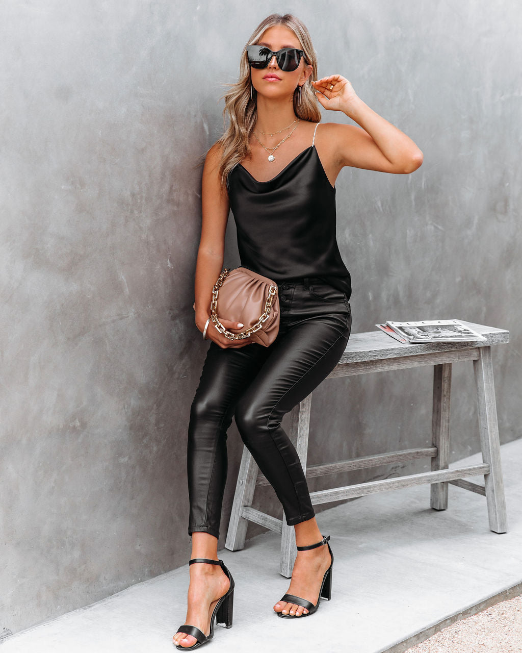 Look so sultry for date night in our Brilliance Satin Cowl Neck Cami Tank! This black satin top features sparkling rhinestone straps. The bust is lined. We love how this sexy top pairs with faux leather pants and heels. Styled with the Carson Black Frame Dark Smoke Polarized Sunglasses. Perfect Hoop Earrings. 5 Disc Choker. Chloe Mini Necklace. Compass Coin Necklace. Simple Bangle Bracelet. Chic Crossbody Chain Pouch Bag. Soho High Rise Coated Skinny. and Whimsy Heel.