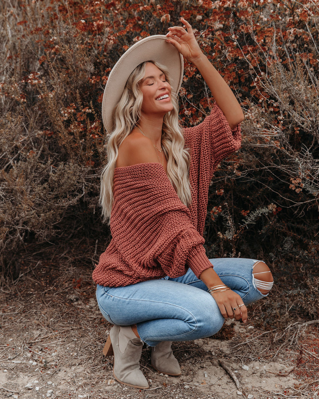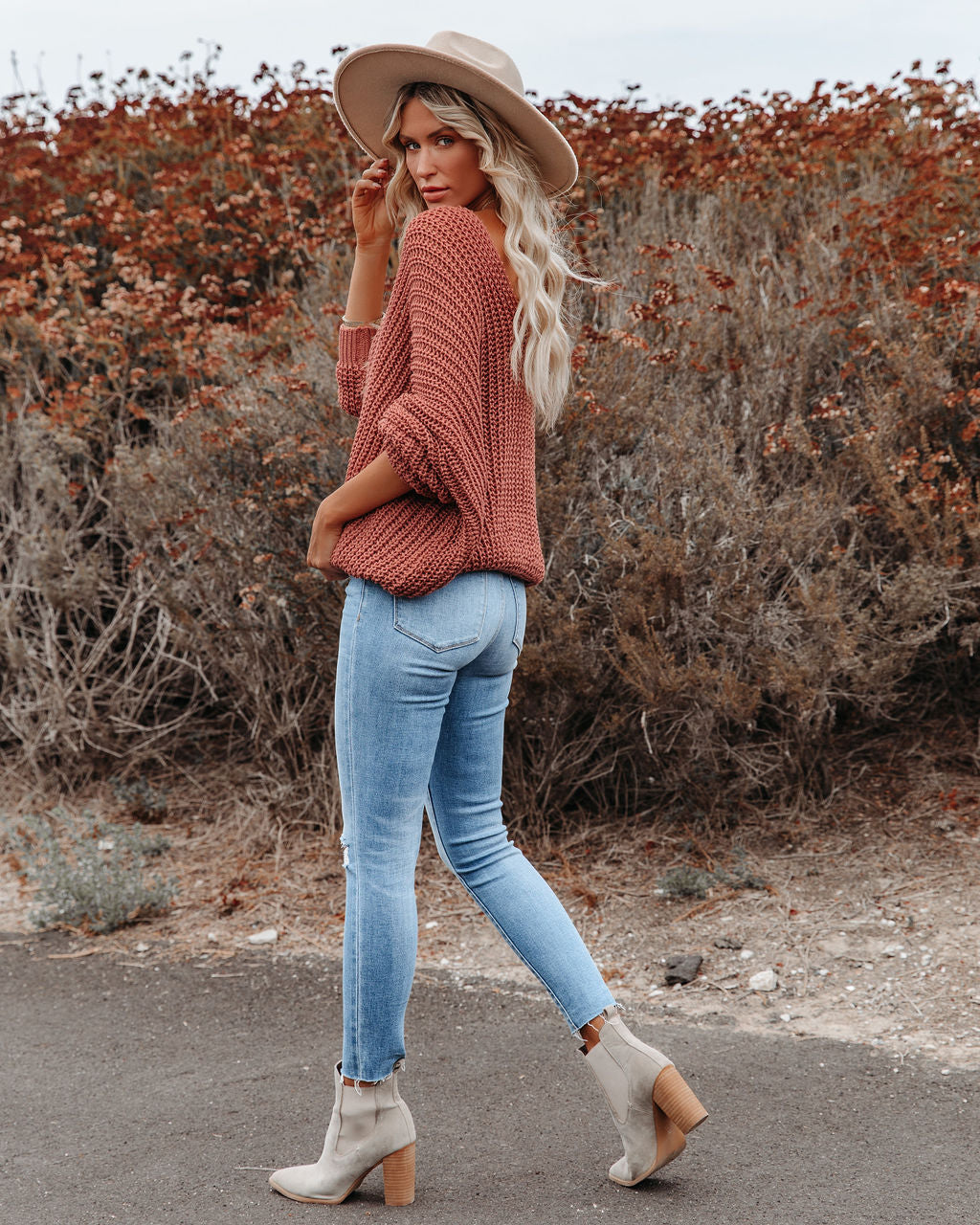 //INSSTREET// Best Seller// Our Carry On Knit V-Neck Sweater is the most chic and coziest of them all! Indulge in the dusty cedar hued knit that's cut to fit relaxed and subtly oversized for max comfort and style. Fit with a v-neckline. long rib cuffed sleeves and a ribbed hemline. A trend-forward piece that pairs effortlessly with skirts. denim and jeggings all season long! Styled with the El Dorado Hat. Perfect Hoop Earrings. Chloe Mini Necklace. Compass Coin Necklace. Trecca High Rise Distressed Skinny. and Uptown Faux Suede Heeled Bootie.