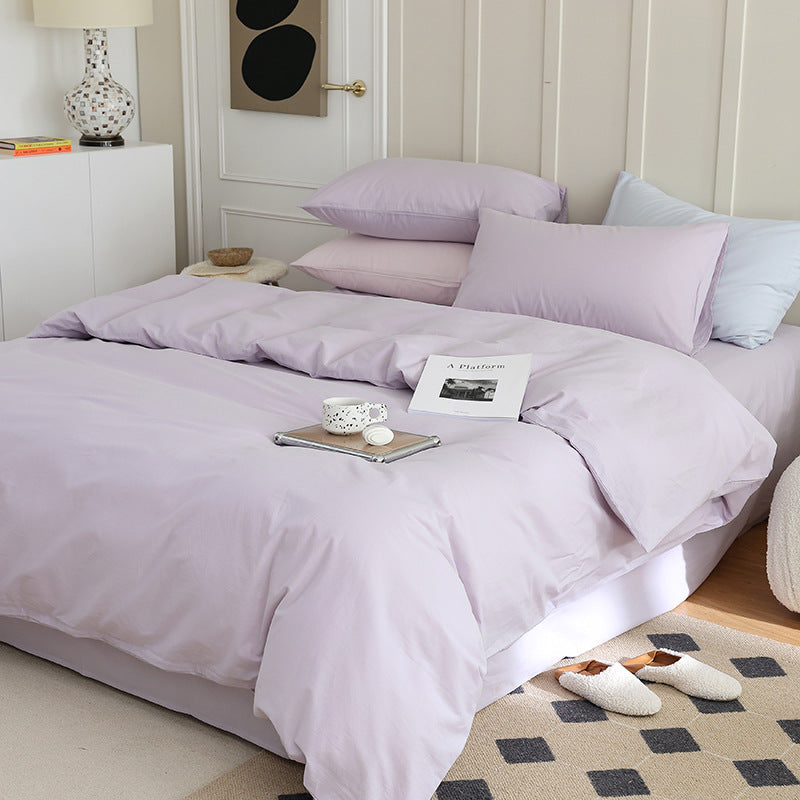1. Purple:Plain purple duvet cover. plain pillow cases and blue/yellow checkered bed sheet