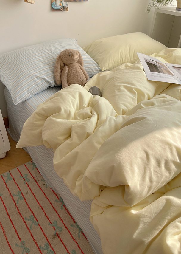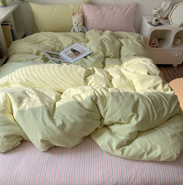 3.Green: Plain green duvet cover. plain pillow cases and dark blue/yellow checkered bed sheet
