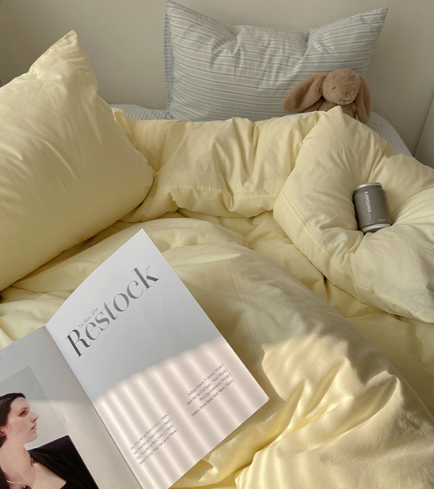 1. Purple:Plain purple duvet cover. plain pillow cases and blue/yellow checkered bed sheet
