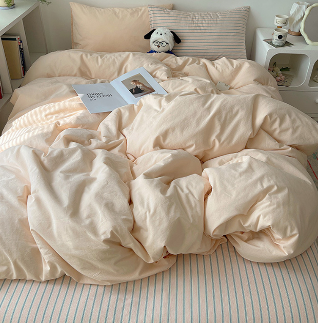 2.Beige: Plain beige duvet cover. plain pillow cases and brown checkered bed sheet