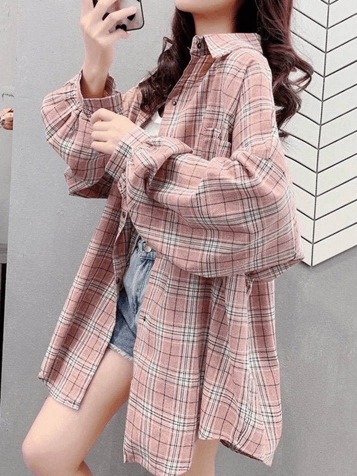 Description: Step up your fashion game with this vintage-inspired checkered blouse. Crafted from a comfortable blend of cotton and polyester. it boasts a loose fit that flatters all body types. The turndown collar and long sleeves exude a casual yet trendy vibe. Its retro print. drop shoulders. front pocket. and button closure add a touch of uniqueness. Embrace the charm of the past with this stylish piece.